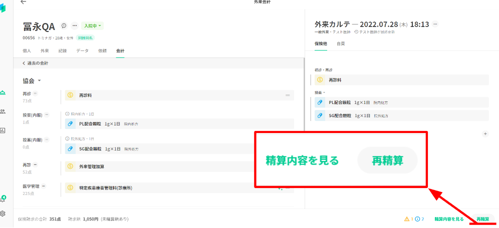 4.リセット後、会計画面に戻ると右下のボタンが「再精算」と表示されます