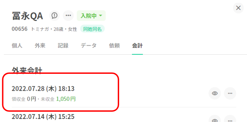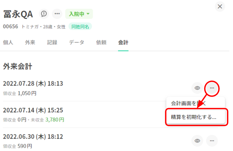 1. 会計履歴一覧より取り消したい会計日時横の「...」を押下し、操作メニューを開きます