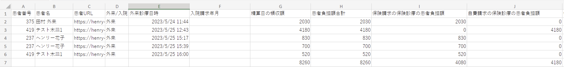 9 | 患者負担額合計 | 500 | 本日、患者に請求した金額は500円 |