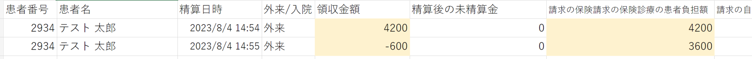 「精算日時」14:54の精算記録(Excel上段の記録)において、「領収金額」4200円、「請求の保険請求の保険診療の患者負担額」4200円と表示されます。その後の会計の修正分は、14:55の清算記録(Excel下段の記録)が別途表示されます。ここでは、領収金額として差額の‐600円が表示され、「請求の保険請求の保険診療の患者負担額」は修正後の3600円と表示されます。