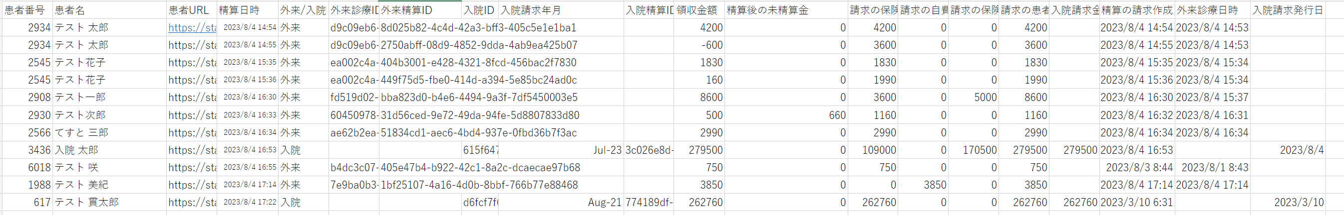 6 | 外来診療ID | 各外来の会計記録固有の番号 | 同じ会計に紐づく清算記録(Excel表示データでいう各行)は同じIDとなる |