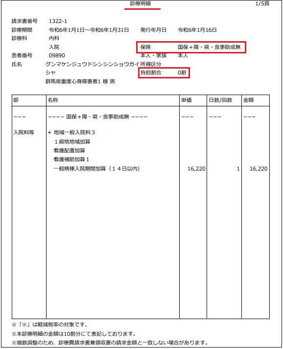【入院時明細書と請求書】 1.こちらは入院費の「診療明細」になります 2.「保険」の種類は公費登録時に選択した「国保+障・県・食事助成無」が反映されているのが確認できます