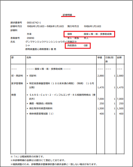 1.同様に明細書上で、国保と受給者証が反映されていることが確認できます 2.負担割合が、0割と表記され自己負担が無しということを示しています