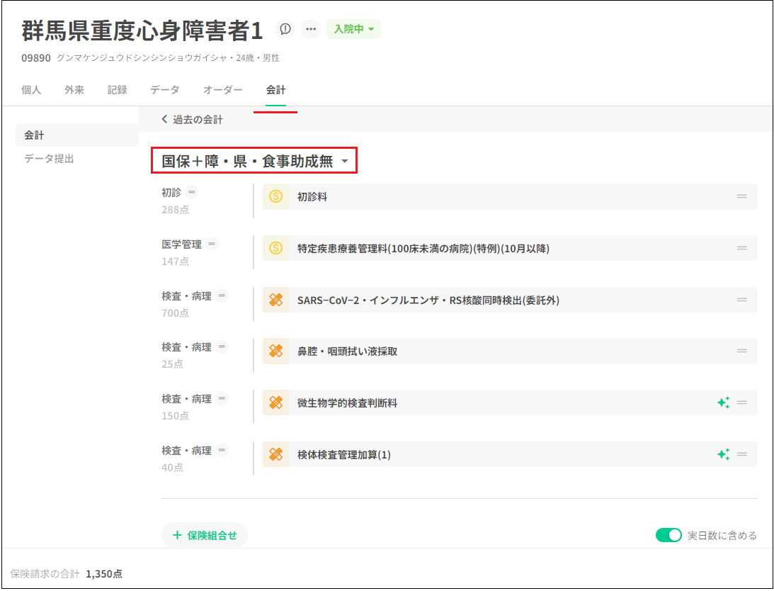 【外来会計画面】 ・会計画面から、国保と受給者証の組合せで会計されていることが確認できます