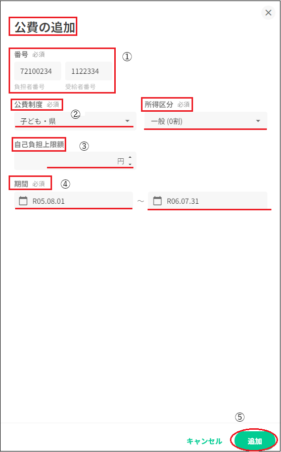 72 子ども医療費助成(県発行) 1.子ども医療費助成の受給者証(県発行)の公費番号を登録します 2.「公費制度」の欄に「子ども・県」が表示されていることを確認します 3.「自己負担上限金額」欄には金額の記載は不要です 4.「期間」を登録します 5.受給者証の内容の登録が終了したら、右下の追加をクリックし登録終了です