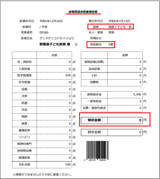 1.領収額が0円のため患者様にお渡しすることはないかもしれませんが、領収書上でも国保と受給者証が反映されていることが確認できます 2.負担割合が、0割と表記され自己負担が無しということを示し、領収金額も0円です