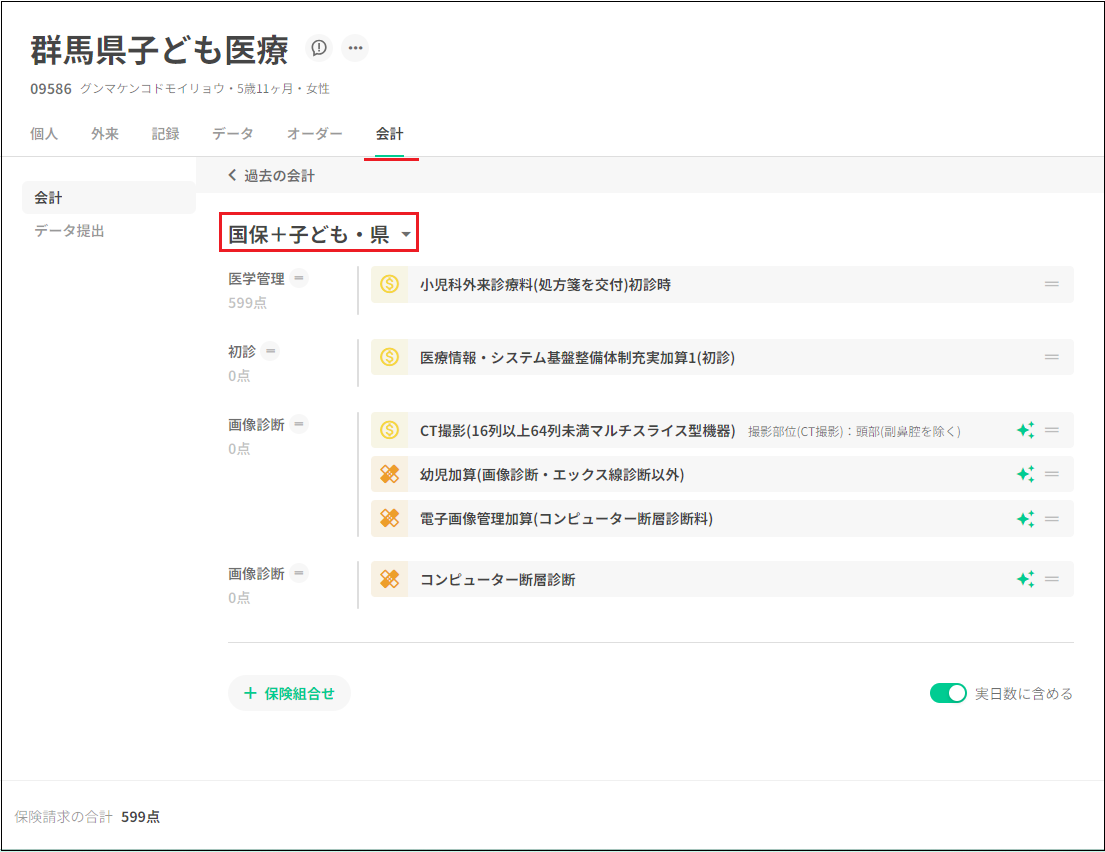 ・会計画面から、国保と受給者証の組合せで会計されていることが確認できます