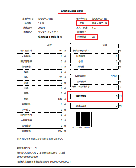 1.領収額が0円のため患者様にお渡しすることはないかもしれませんが、領収書上でも国保と受給者証が反映されていることが確認できます 2.負担割合が、0割と表記され自己負担が無しということを示し、領収金額も0円です