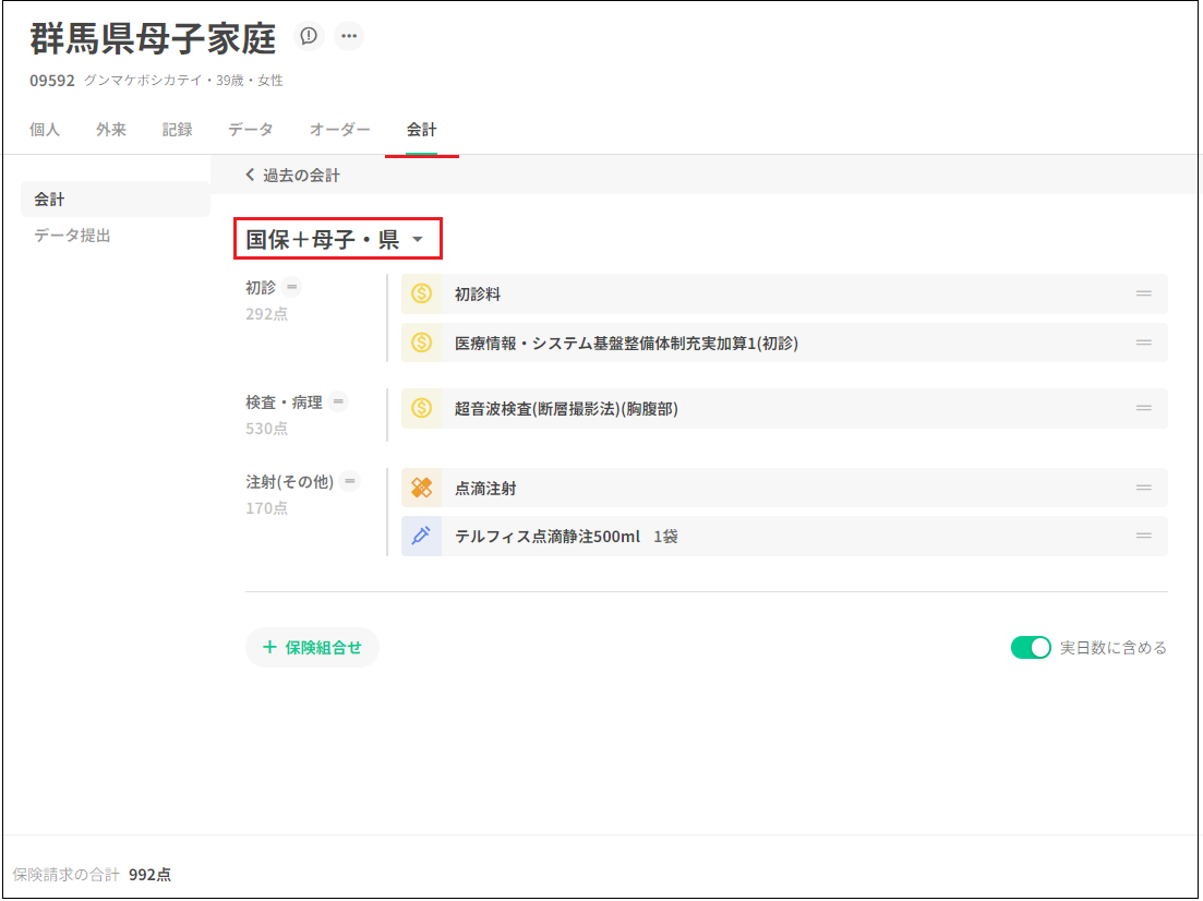 【外来会計画面】 ・会計画面から、登録した国保と受給者証の組合せで会計されていることが確認できます