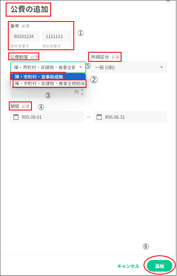 1.重度心身障害者医療費助成(市町村発行)の受給者証の公費番号を登録します 2.「公費制度」の欄に「障・市町村・食事助成無」と「障・市町村・非課税・食事全額助成」が表示されていることを確認します 3.「自己負担上限額」欄には金額の登録は不要です 4.「期間」を登録します 5.この画面では「障・市町村・非課税・食事全額助成」を選択します 6.受給者証の登録が終了したら右下の追加をクリックし終了です