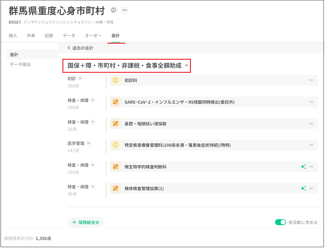 【外来会計画面】 ・会計画面から、国保と受給者証の組み合わせで会計されていることが確認できます
