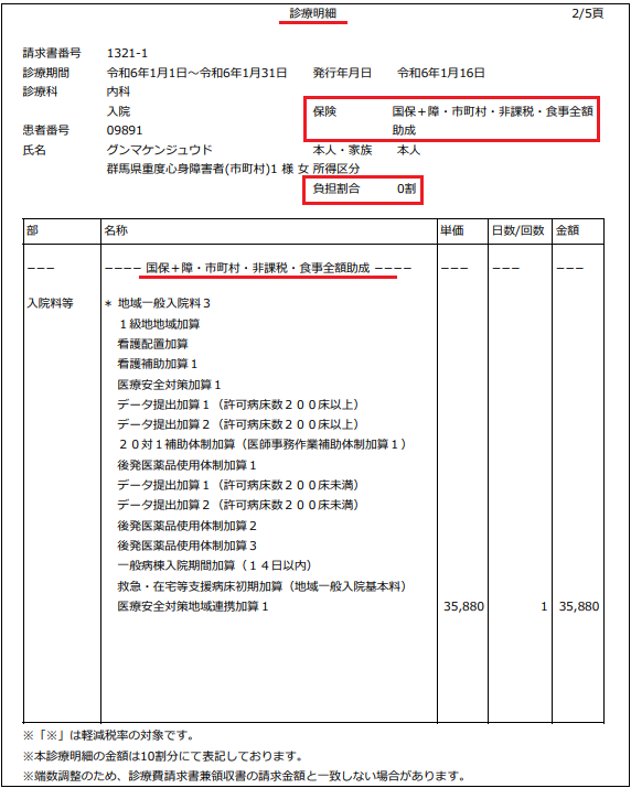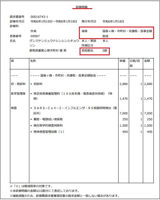 1.明細書上でも、国保と受給者証が反映されていることが確認できます 2.負担割合が、0割と表記され自己負担が無しということを示しています