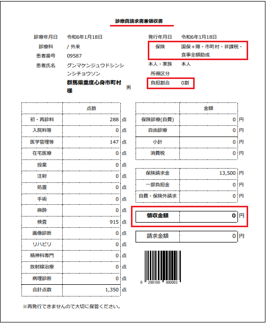 1.領収額は0円のため患者様にお渡しすることはないかもしれませんが、領収書上でも国保と受給者証が反映されていることが確認できます 2.負担割合が、0割と表記され自己負担が無しということを示し、領収金額も0円です