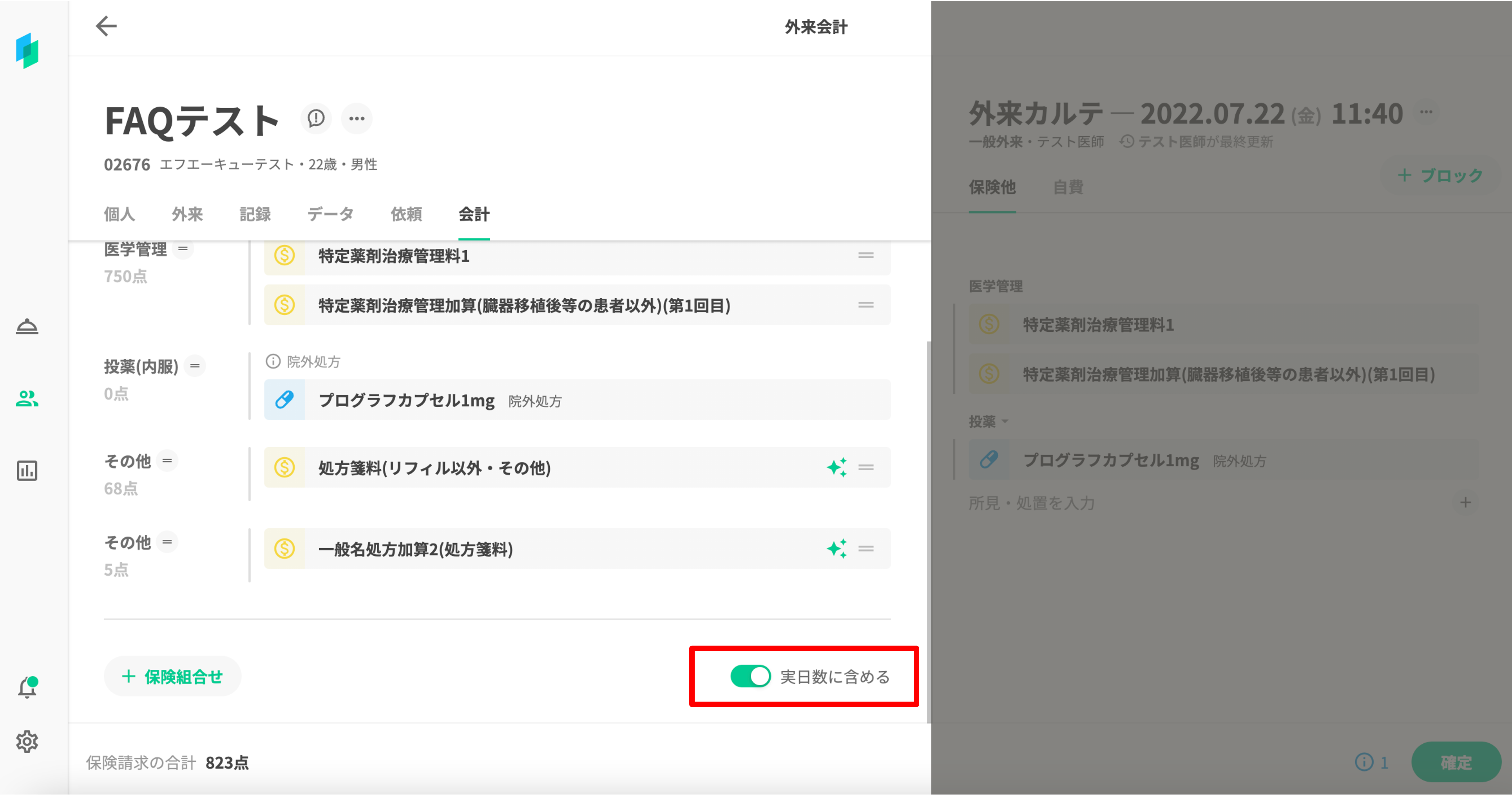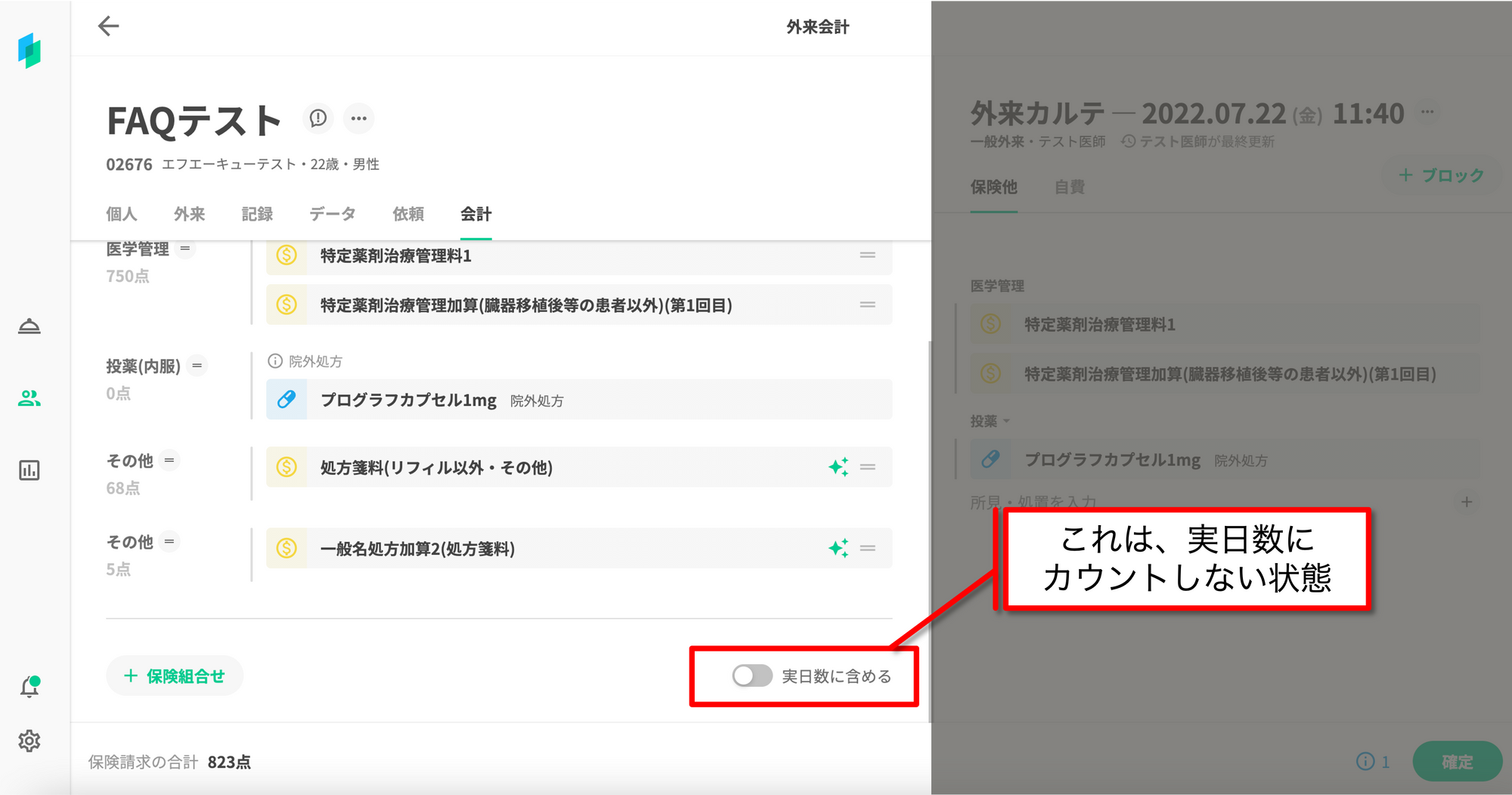 なお、通常の受診は医師の診察をおこなうため、実日数セクションは診療実日数に数えるように初期値が設定されています。(実日数に含める場合は緑色に表示されます。)