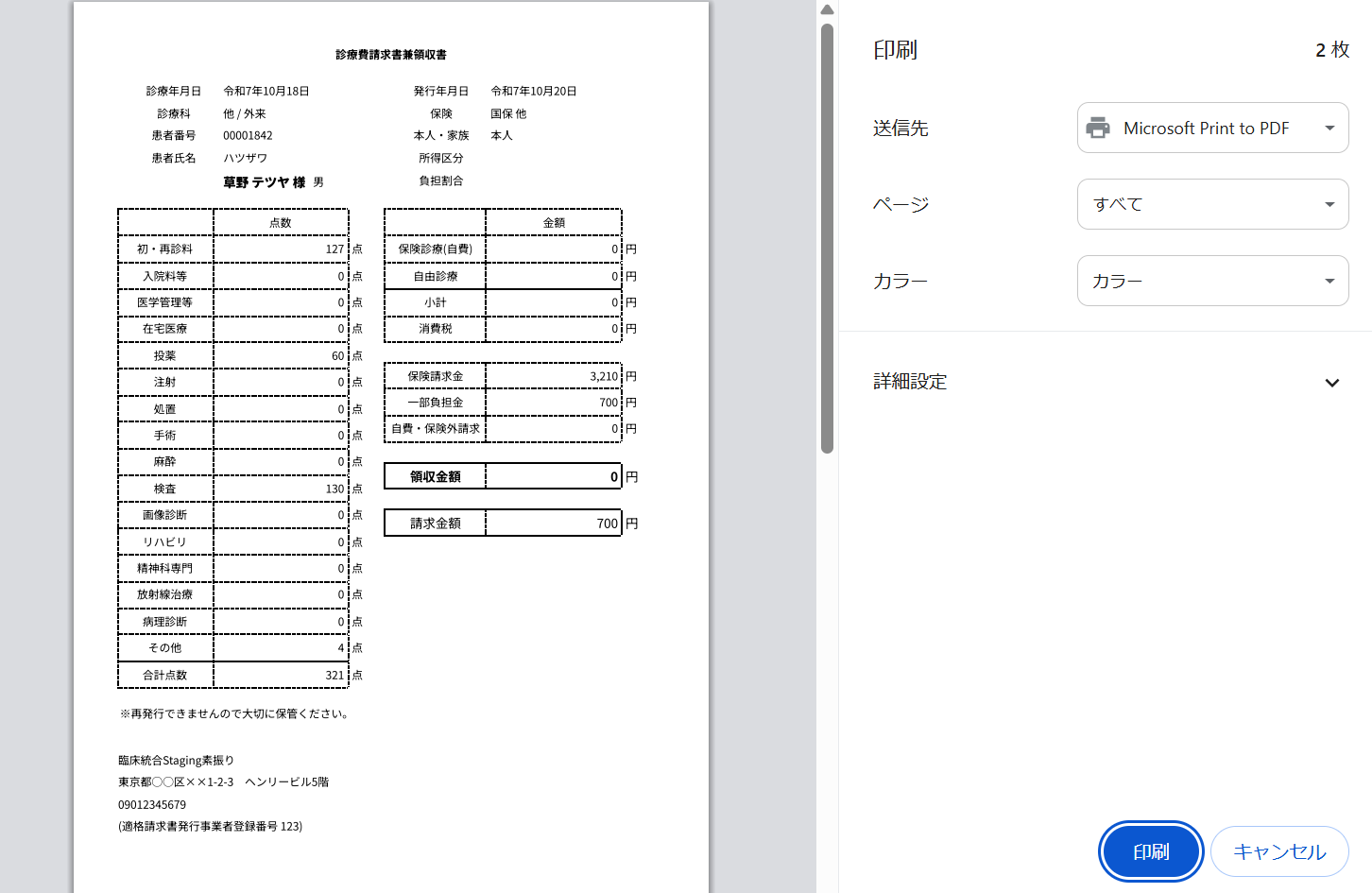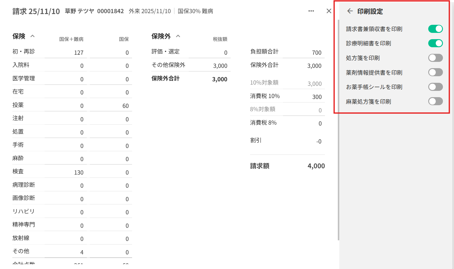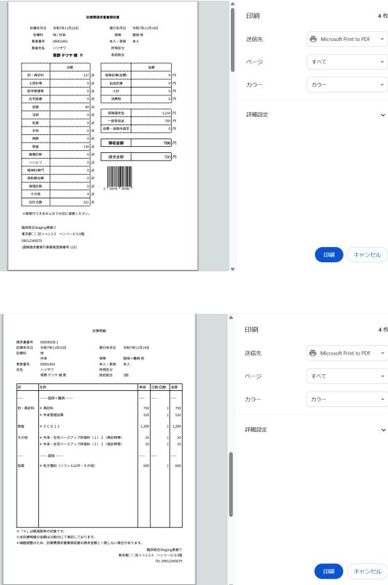 ※今回は印刷設定で「請求書兼領収書」と「診療明細」をONにして印刷します