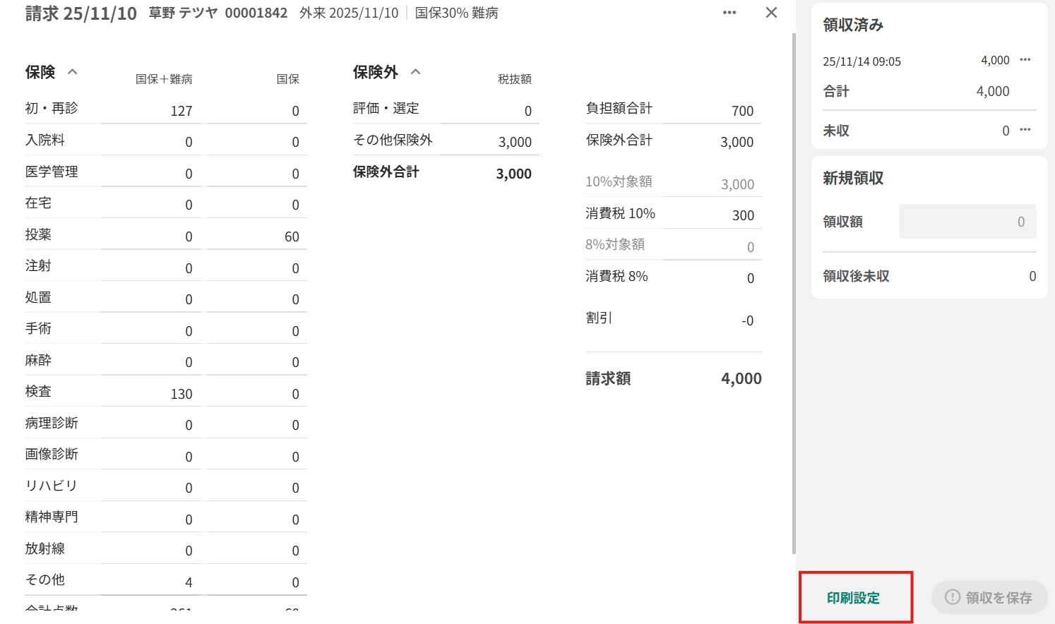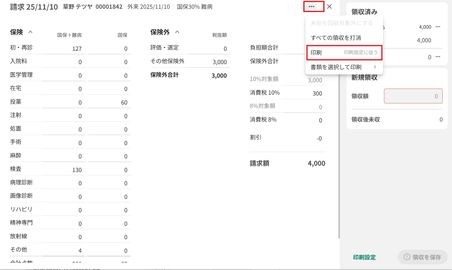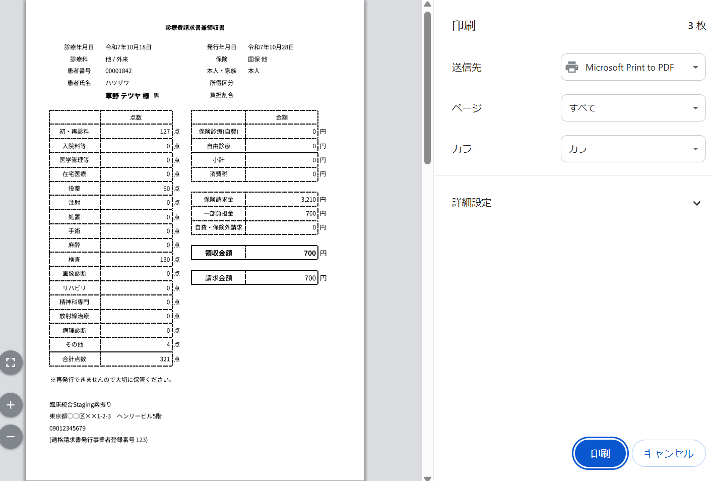 ※今回は印刷設定で「請求書兼領収書」と「診療明細」をONにして印刷します
