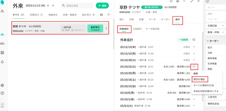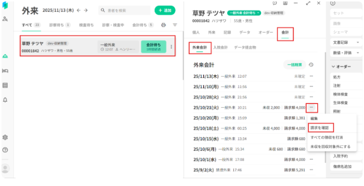 「領収・請求」画面右上の「…」をクリックし、「書類を選択して印刷」を選択し、希望の帳票(請求・領収書、明細書、処方箋)を選択します