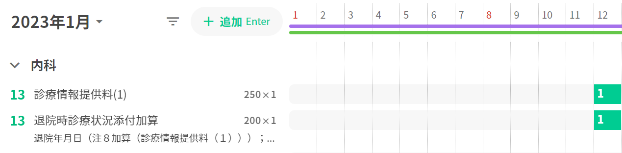 正しいレセプトファイルを出力する為に、コストカレンダー(コスカレ)画面上では、退院時診療状況添付加算は診療情報提供料に算定単位を統合するのではなく、下表の通り、算定単位を分割して入力することにご留意ください。