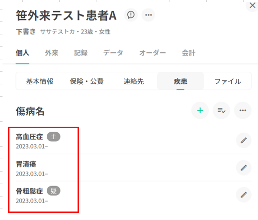 上記の例では、ボナロン錠:傷病名「骨粗鬆症」登録あり