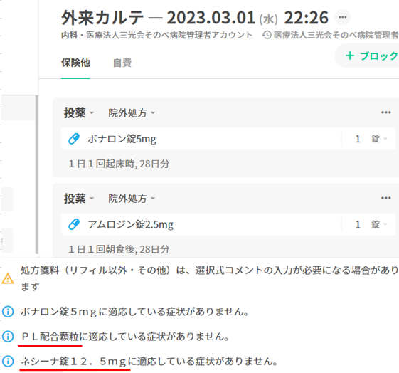 処方薬に対しての適応症の傷病名登録が無い場合にメッセージが出ます。