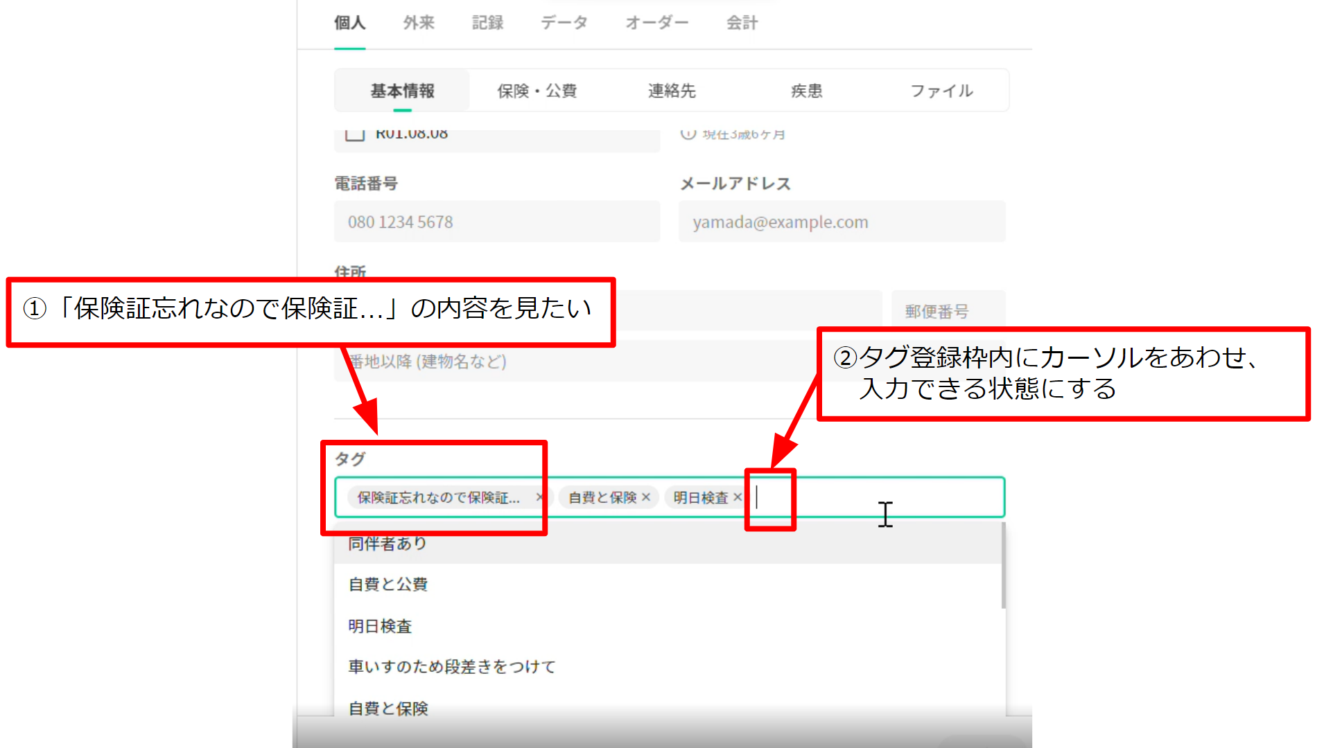タグ登録枠内にカーソルをあわせ、入力できる状態にする