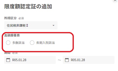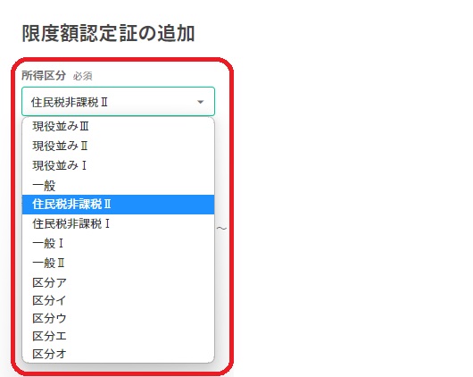 ※限度額認定証の追加画面において所得区分の選択肢に「一般Ⅰ」「一般Ⅱ」が追加されています。