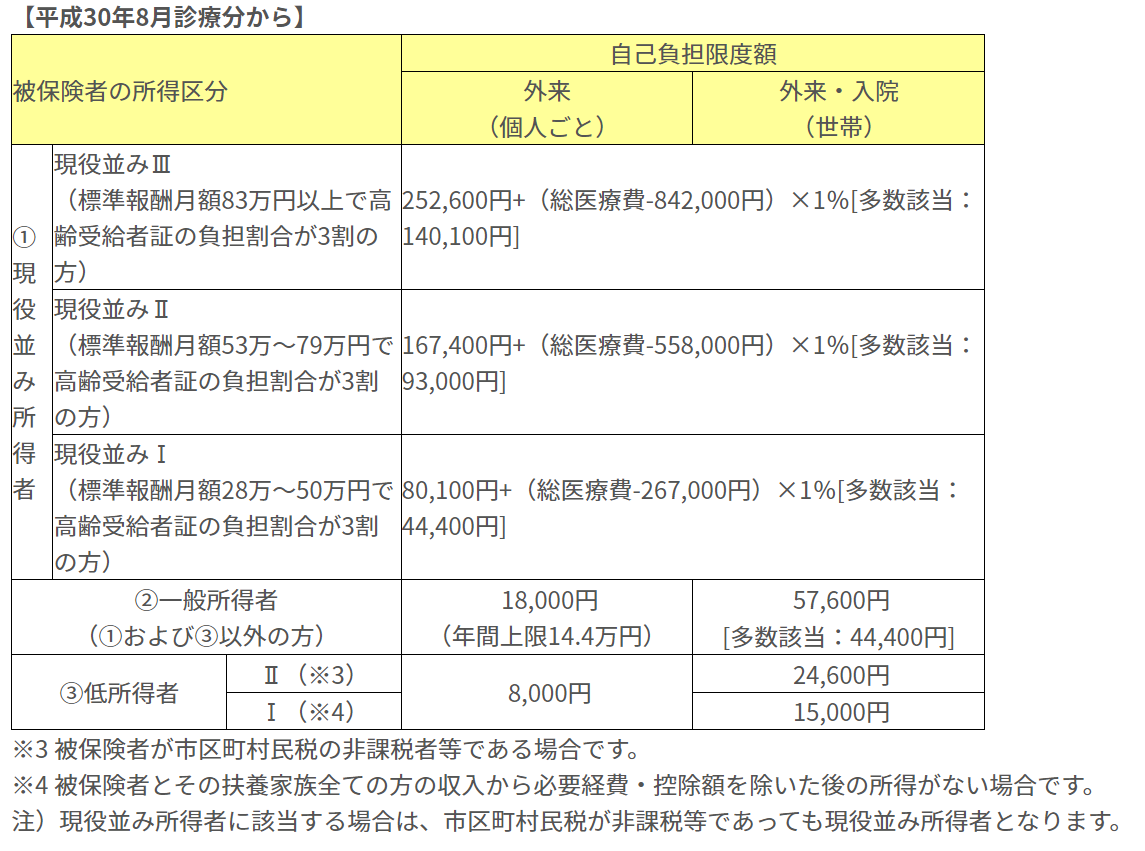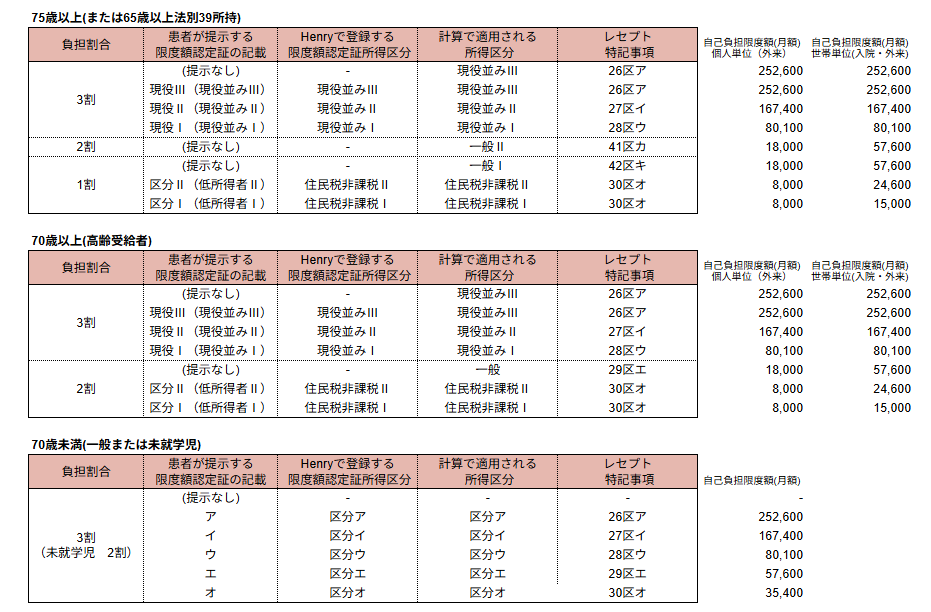自己負担限度額は受診者の年齢および被保険者の所得区分によって下記のとおり分類される。