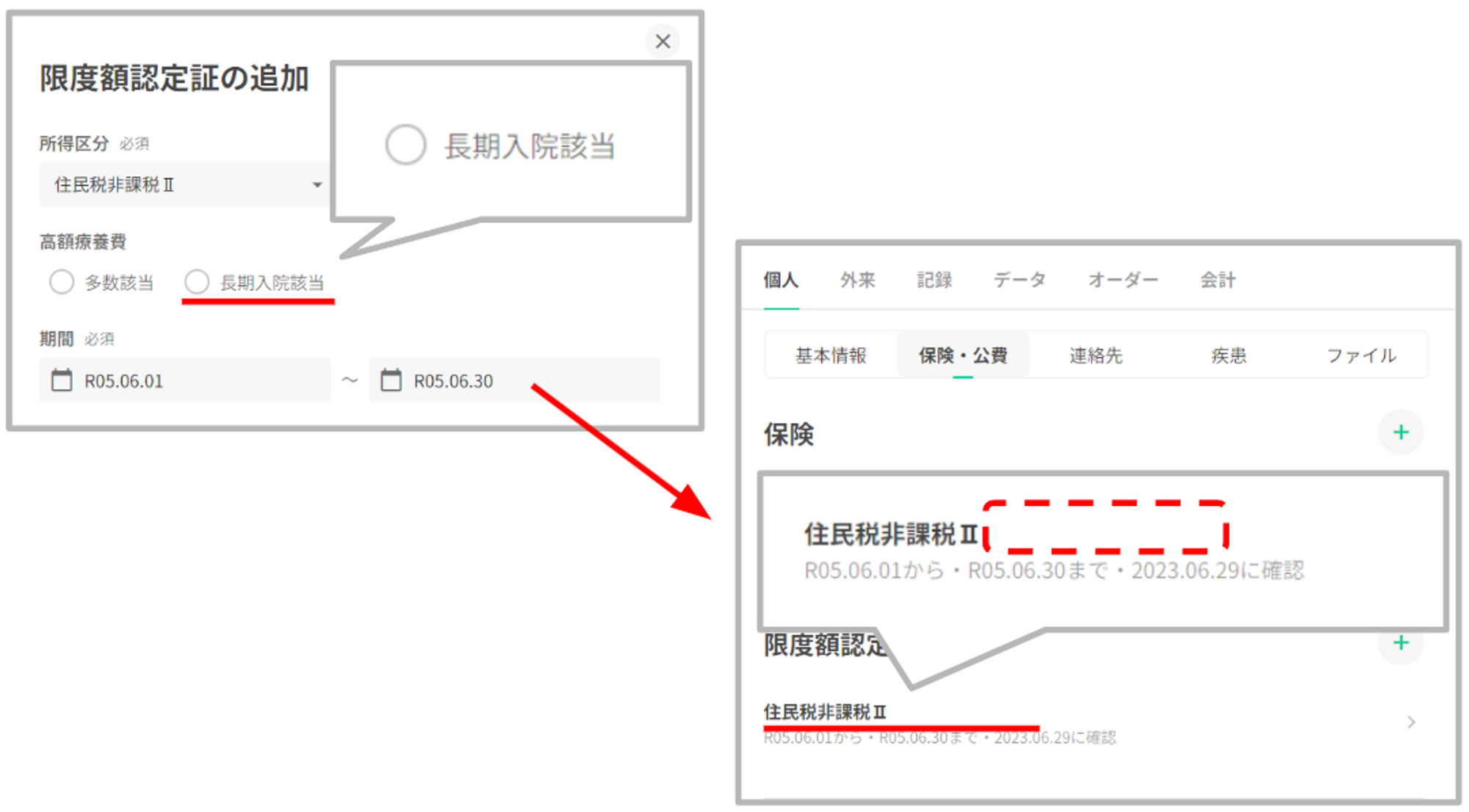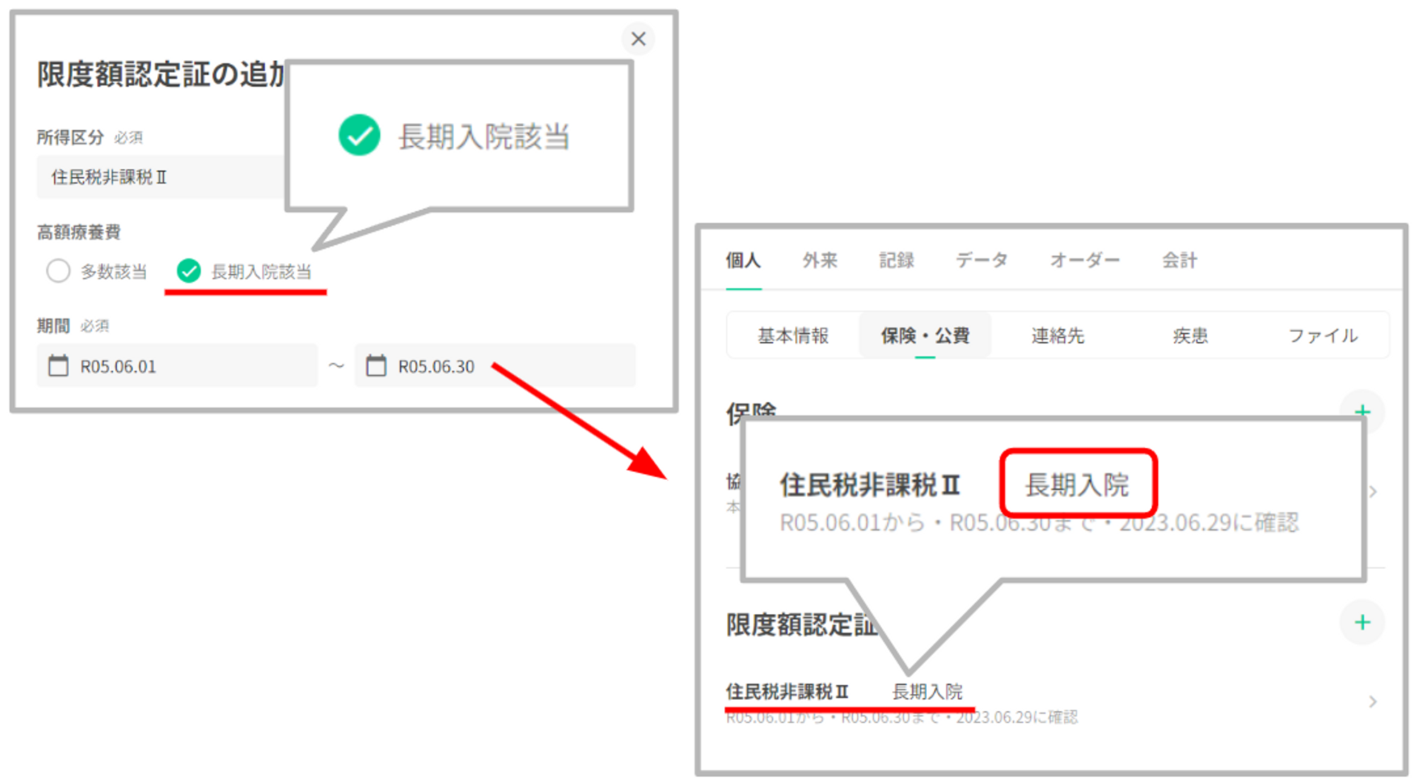 長期入院該当のチェックを有効にした場合、保険・公費一覧には「長期入院」と表示いたします。