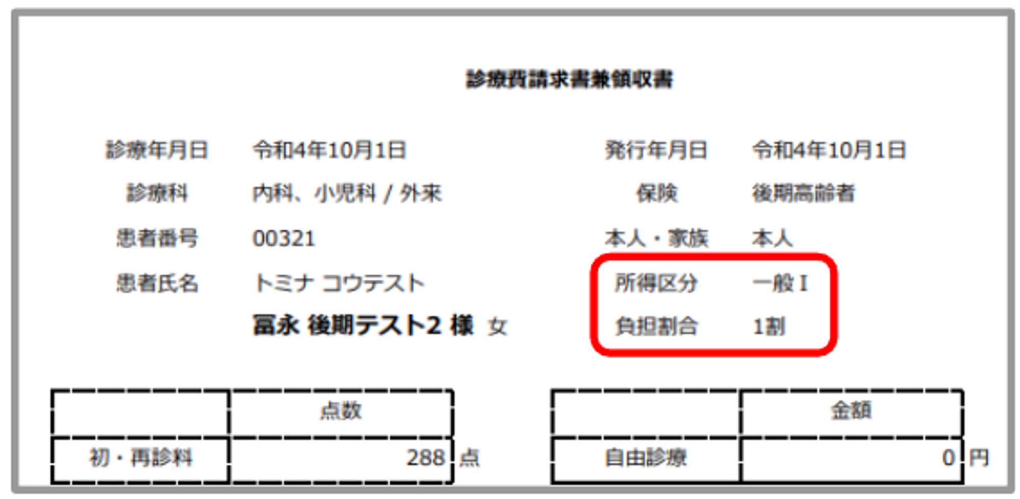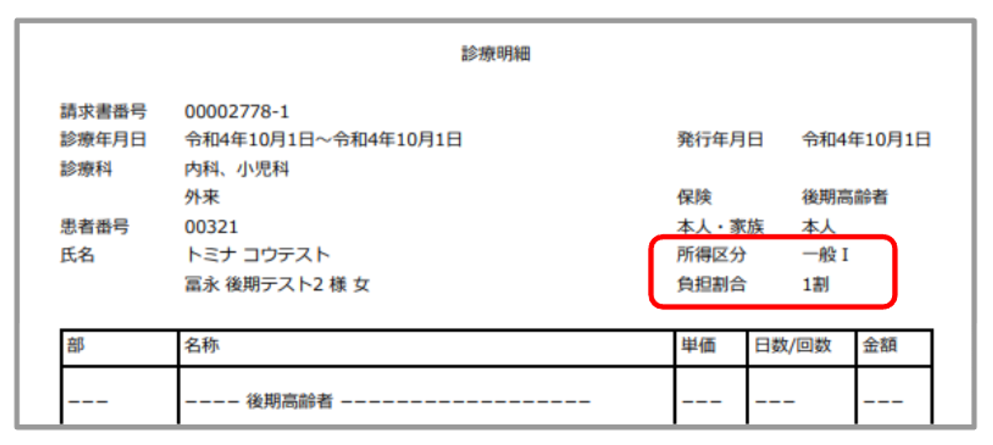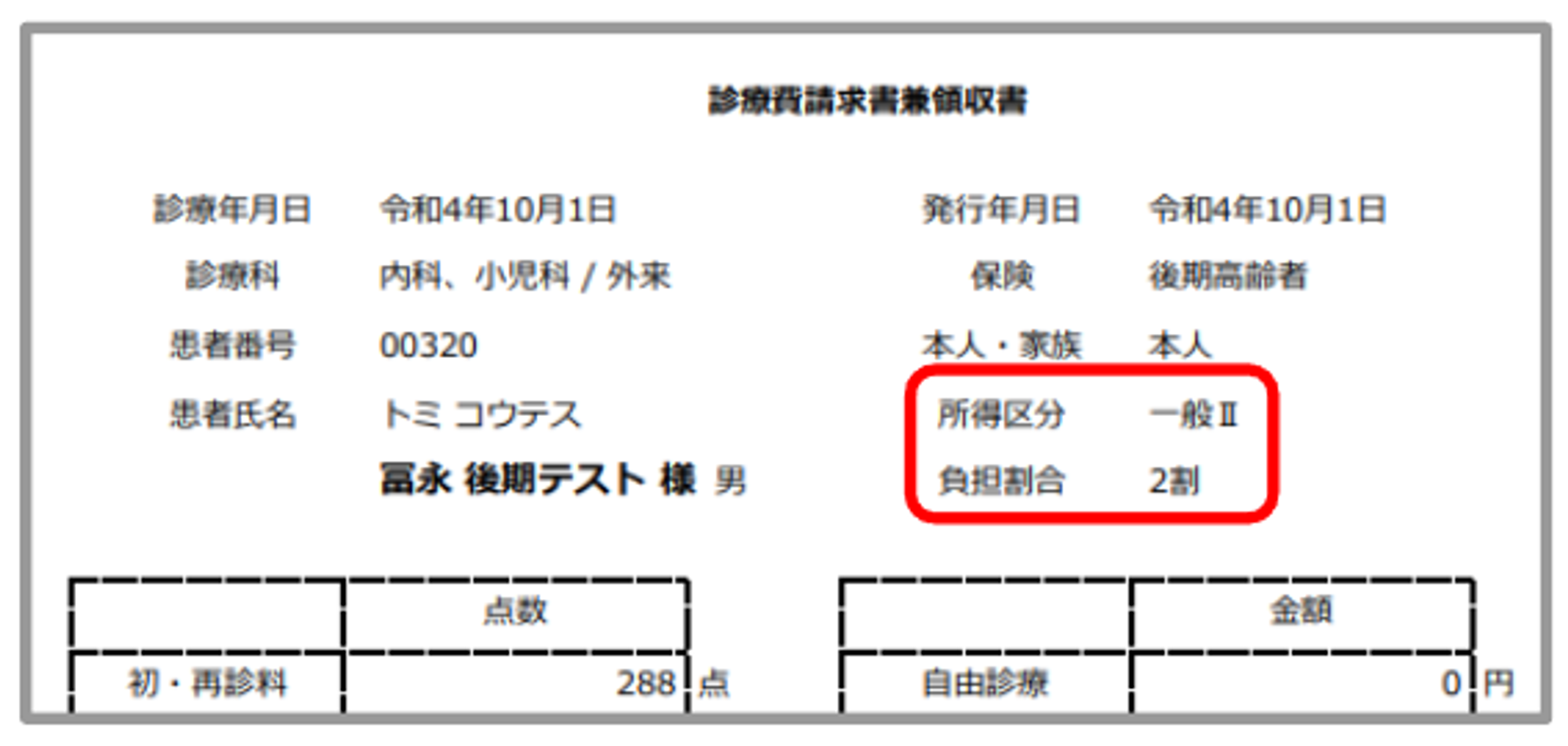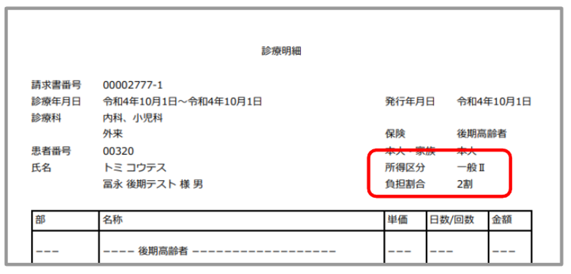 診療明細書、請求書兼領収書、処方箋に新設の所得区分、負担割合で印字されます