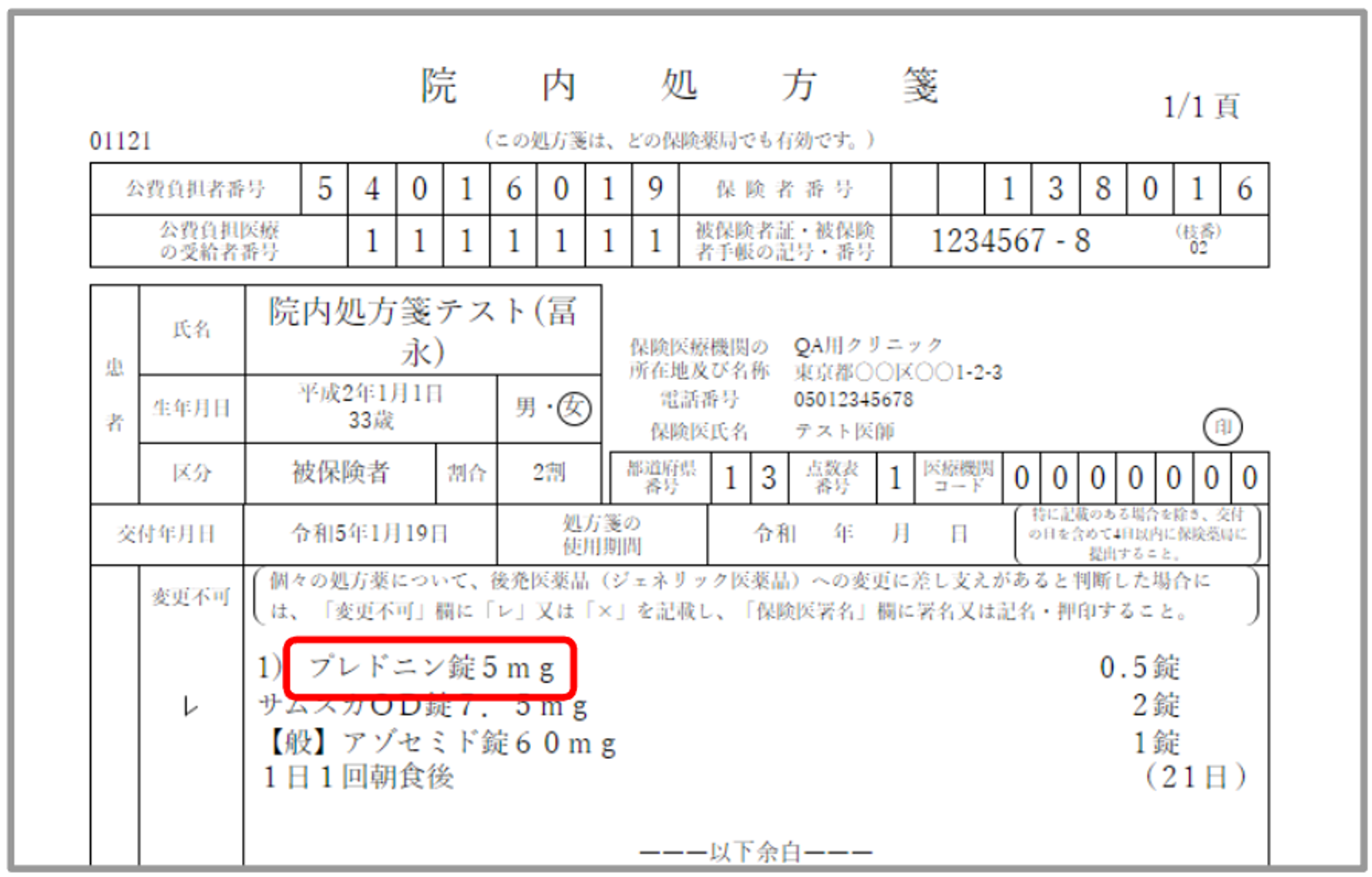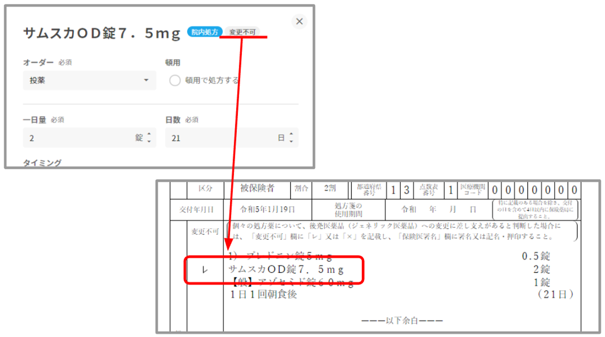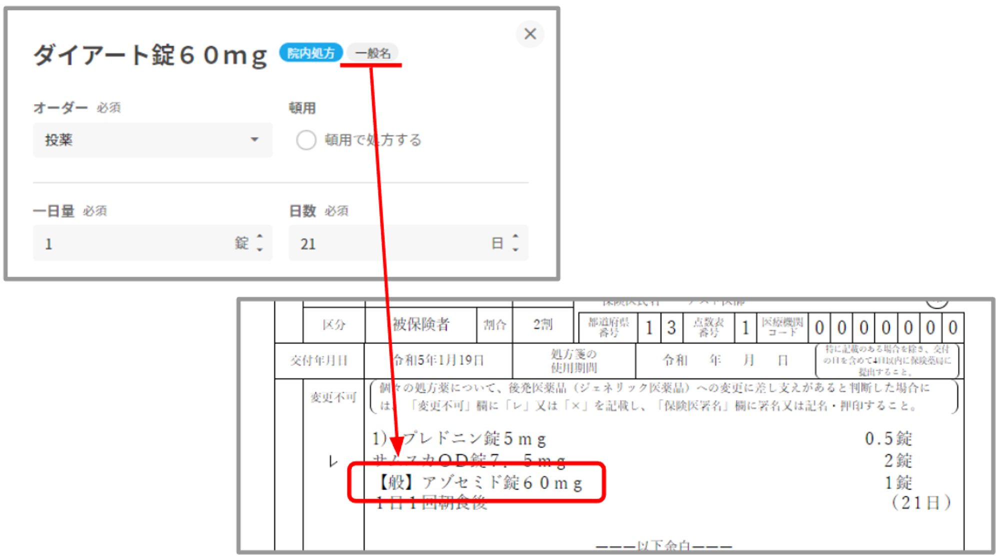 施設薬剤を院内処方した場合、変更不可・一般名の設定に関わらず施設薬剤名で出力されます。