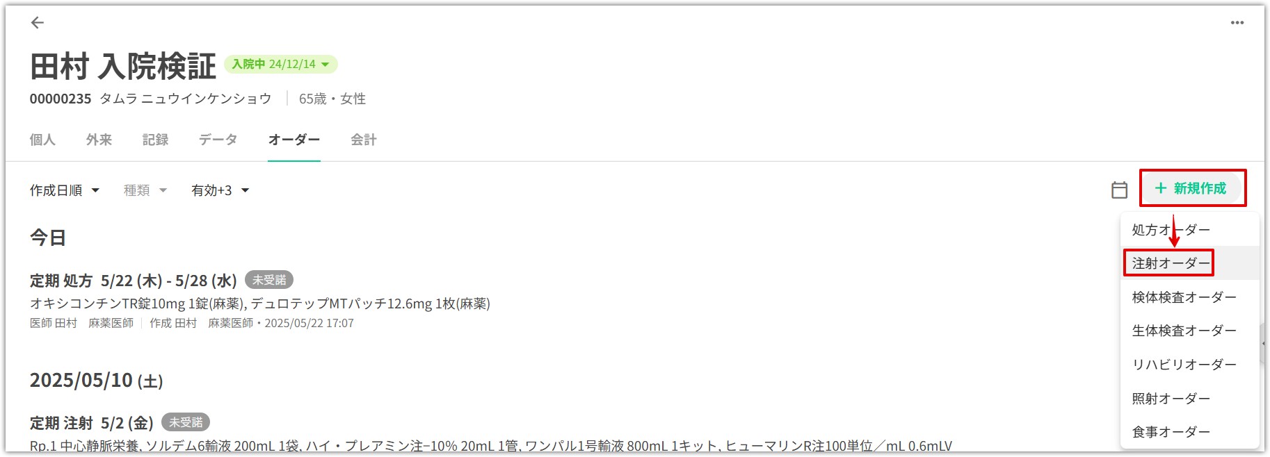 1.オーダータブ→+新規作成→注射オーダーをクリックします。