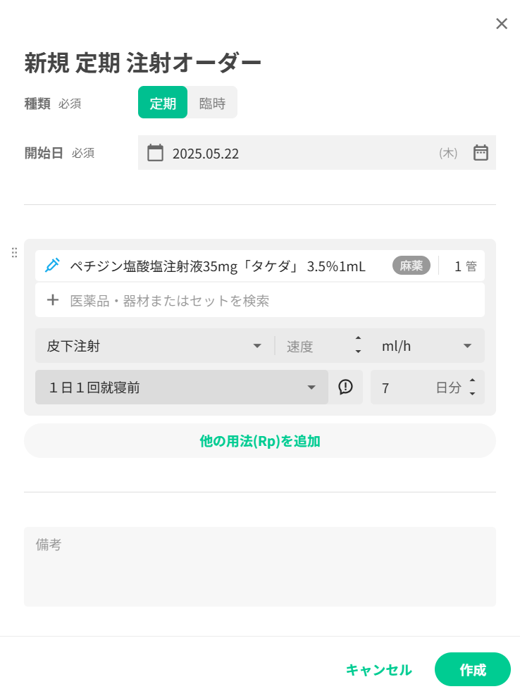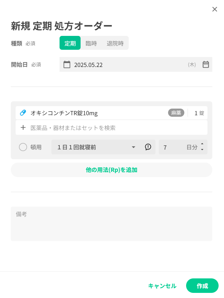 院内麻薬処方箋は、下記にてオーダー作成を作成することで出力が可能となります。