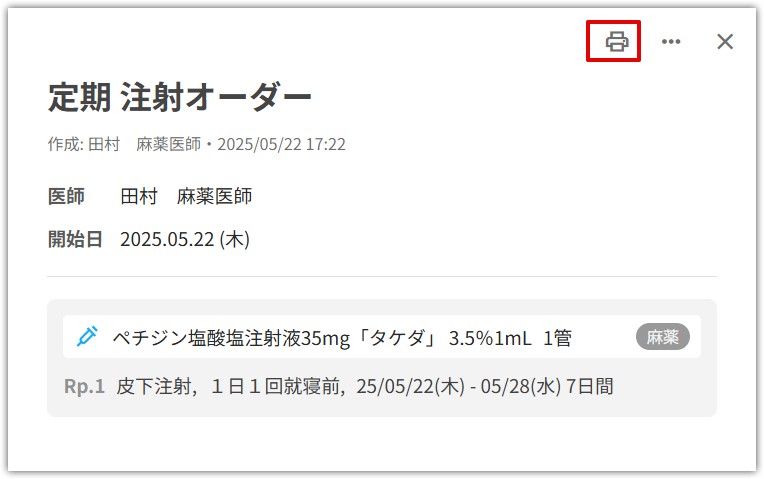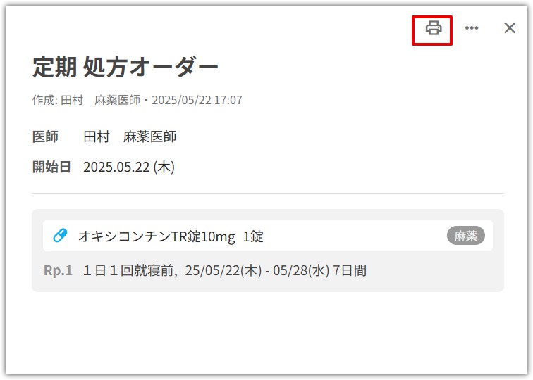 印刷マーククリック後、院内麻薬処方箋が出力可能となります。