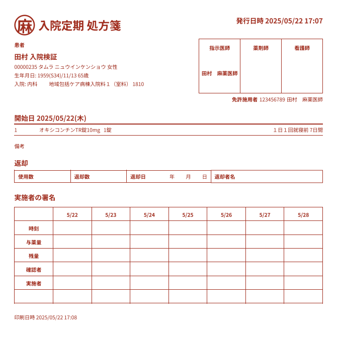 ※院内麻薬処方箋として記載が義務付けられている患者の氏名・年齢、麻薬の品名・分量・用法・用量、処方箋発行年月日、麻薬施用者の記名、免許番号が記載されます。