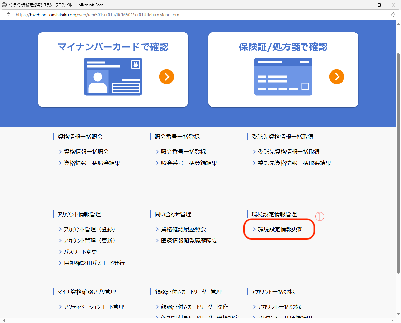 ① オンライン資格確認等システムにログインしたら、[環境設定情報更新]をクリック