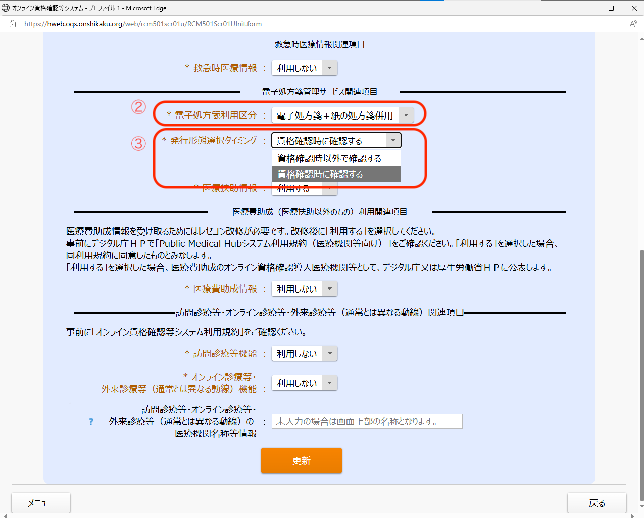 ② 電子処方箋利用区分を[電子処方箋+紙の処方箋併用]にする