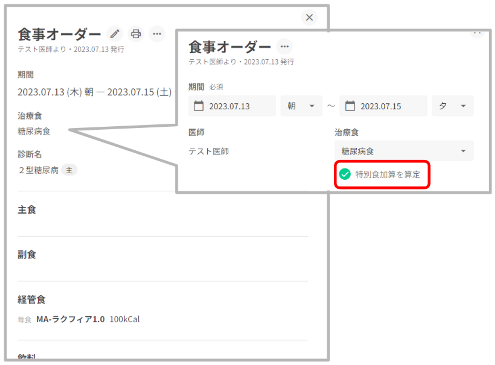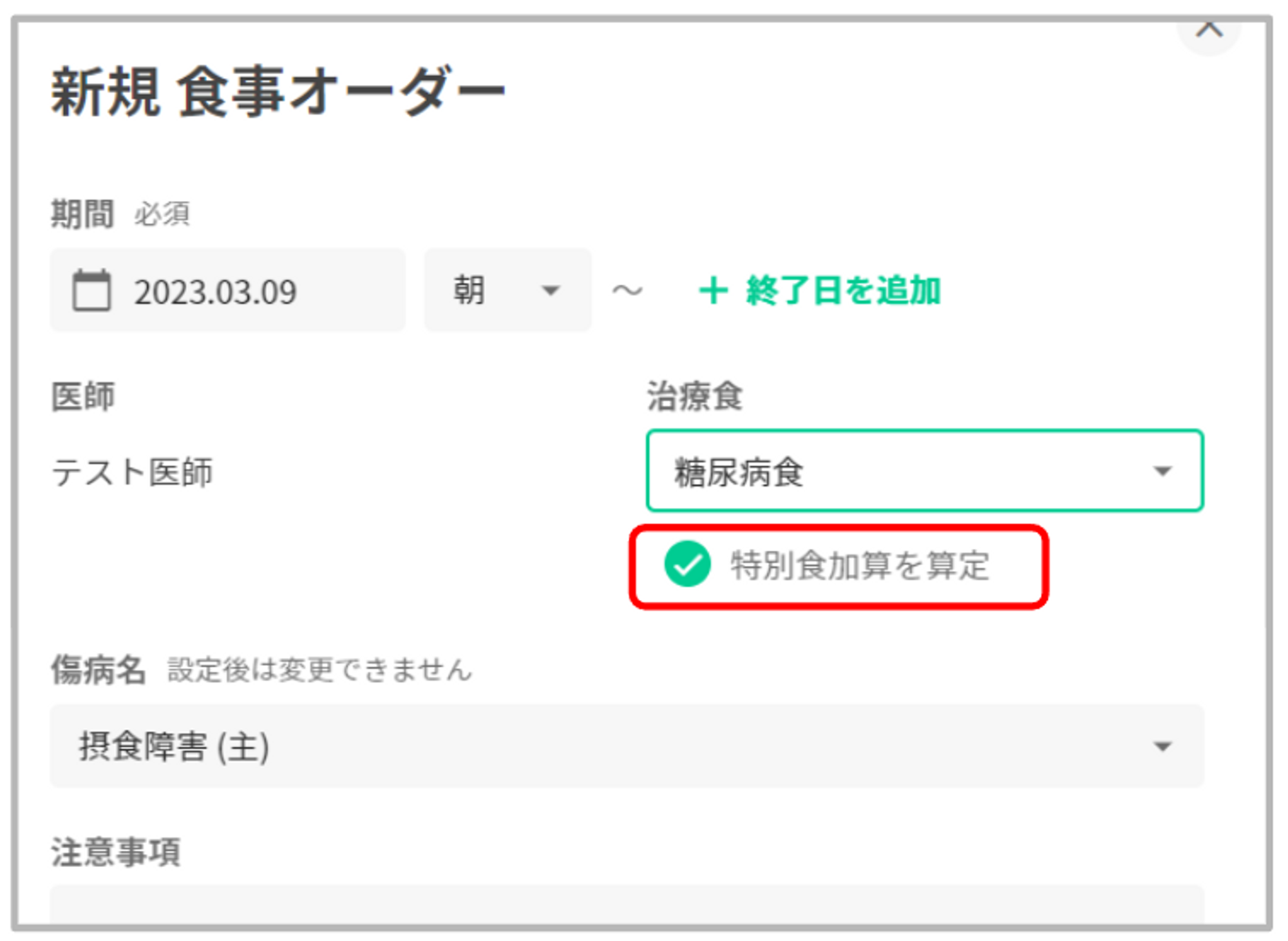 特別食加算を算定」というチェックボックスが表示されます。デフォルト表示では✅された状態になりますので、加算要件を満たさない場合は✅を外してオーダーを作成してください。