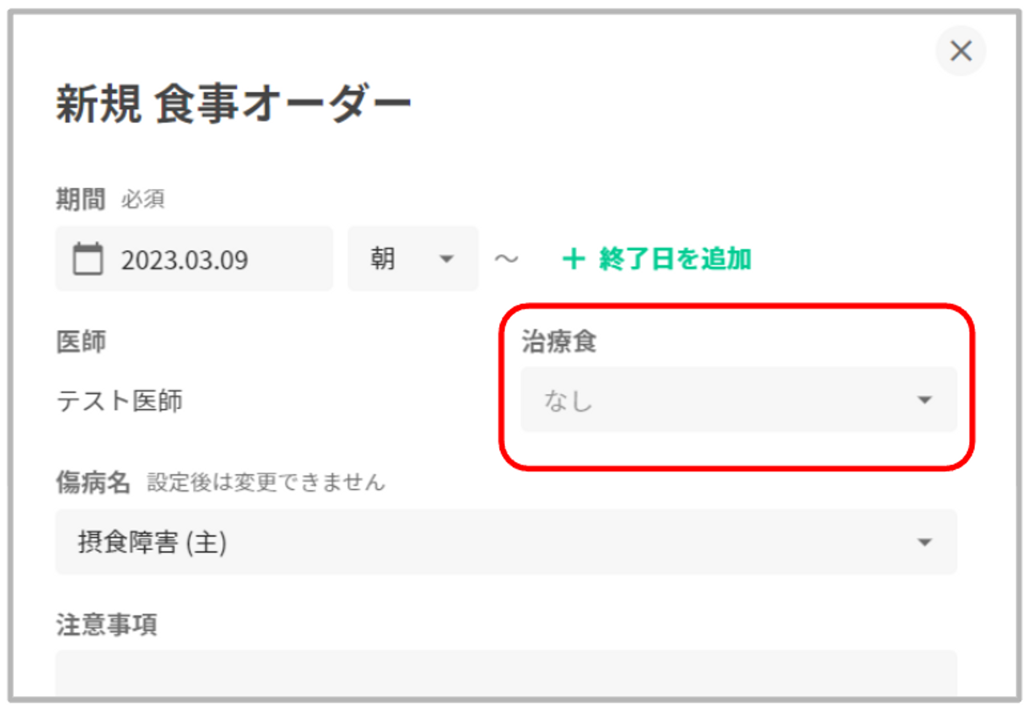 一度✅を外すと、治療食の選択項目を変更しても有効にはならないため、手動で✅をつけてください。