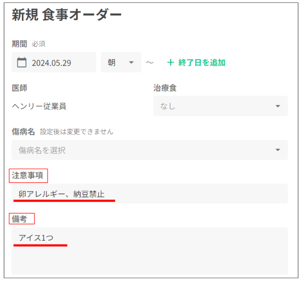 禁止食品や付加食品については、オーダー作成時に以下の注意事項や備考欄への入力をお願い致します