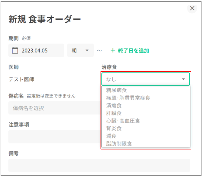 患者のオーダータブより食事オーダーを作成することが出来ます。