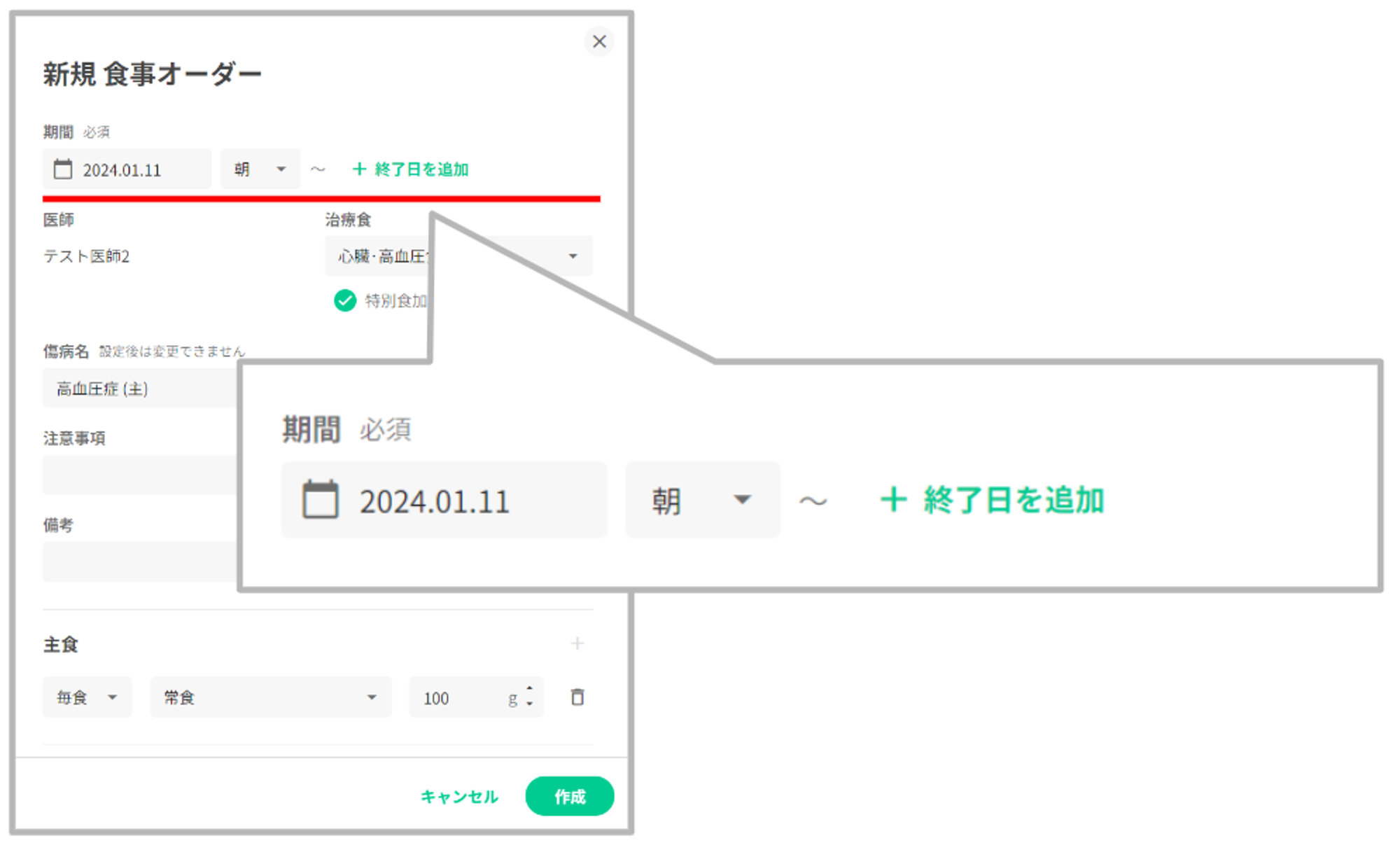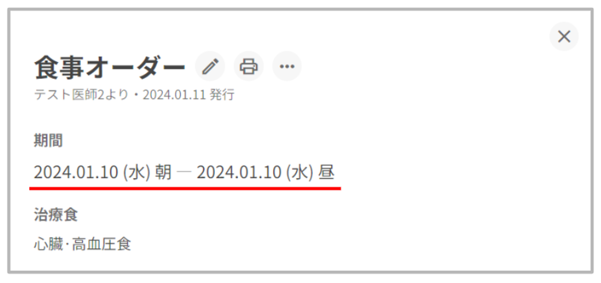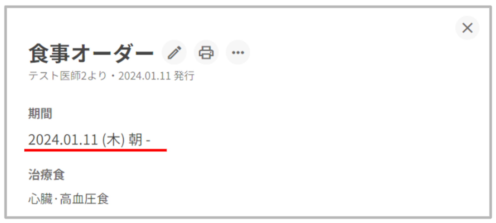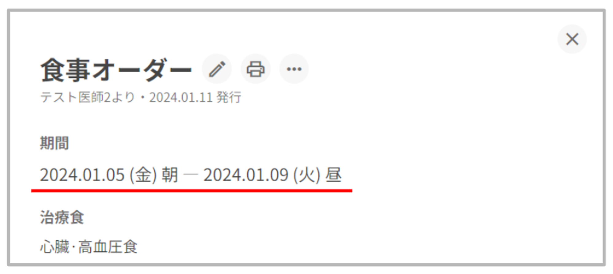 単日オーダーであり夕食のみのオーダーの場合、「開始日=終了日」となるため開始日のみ表示いたします。