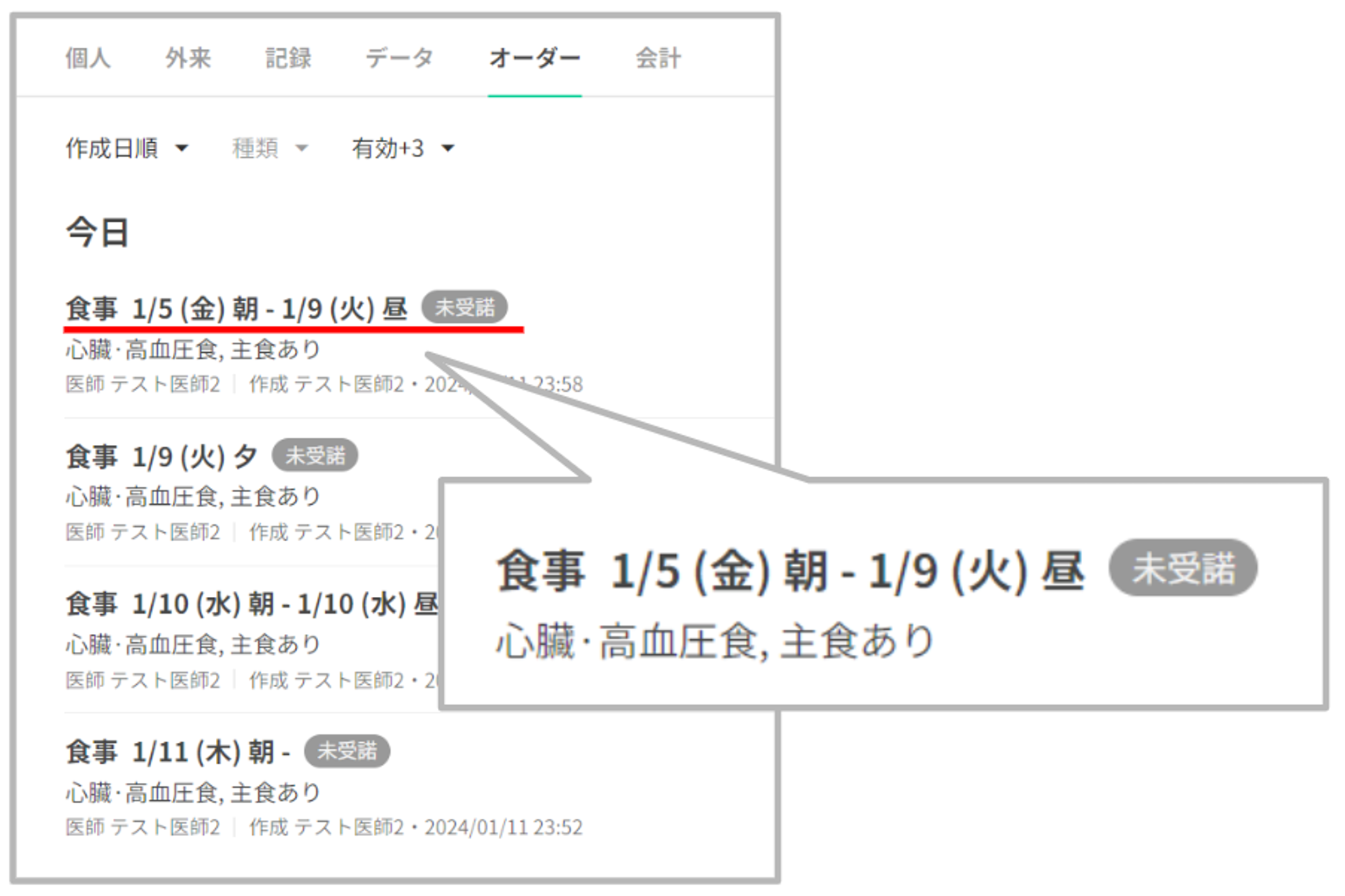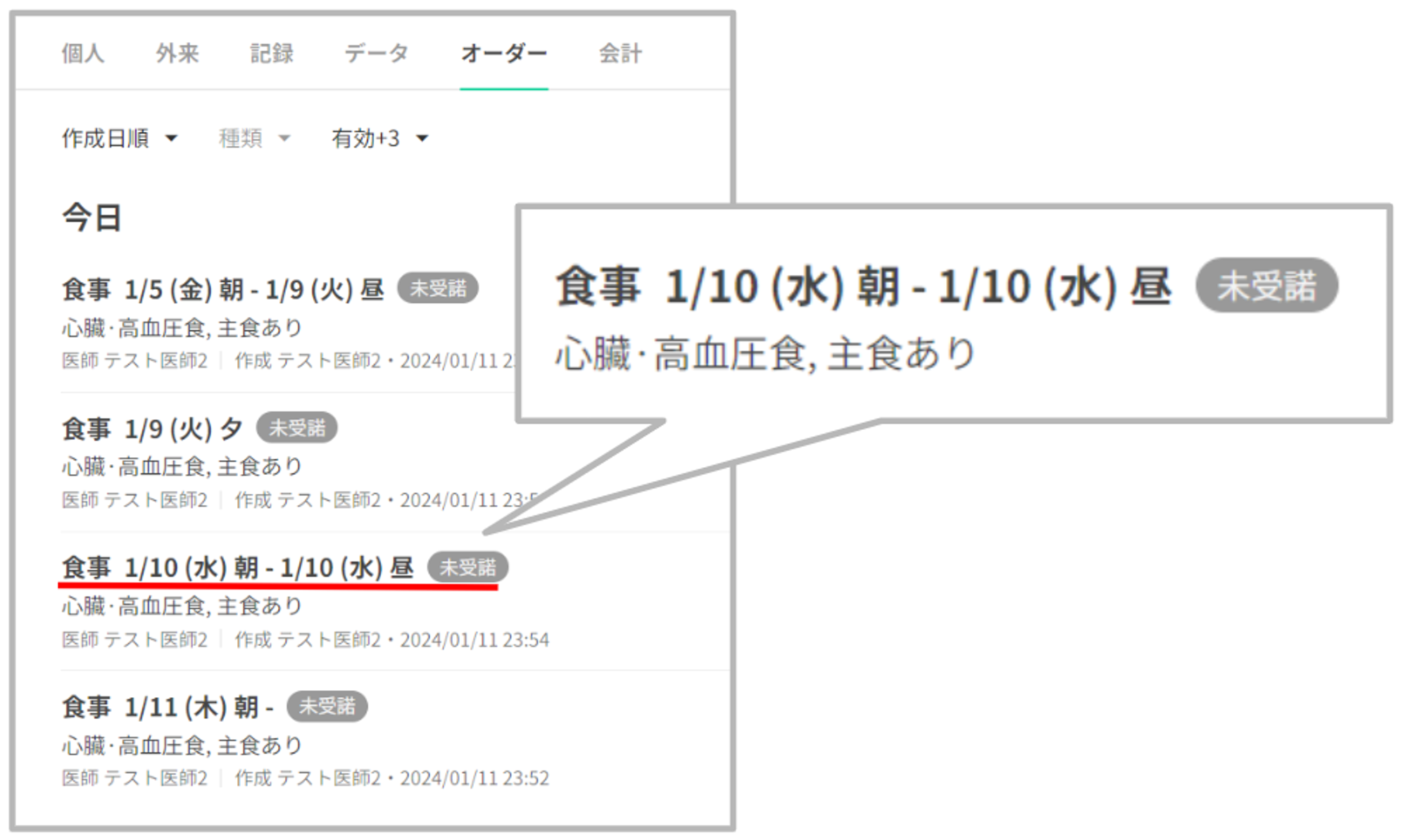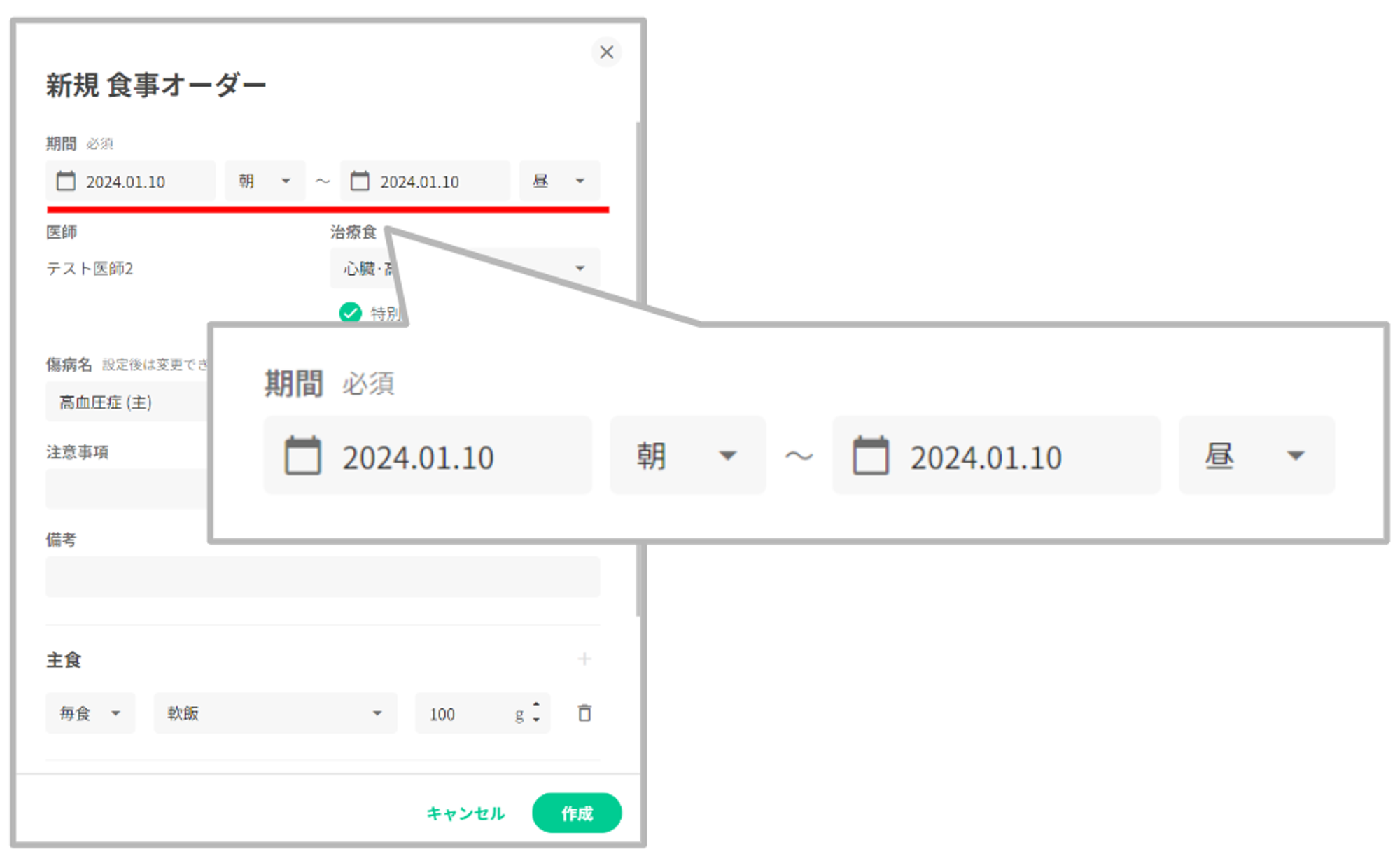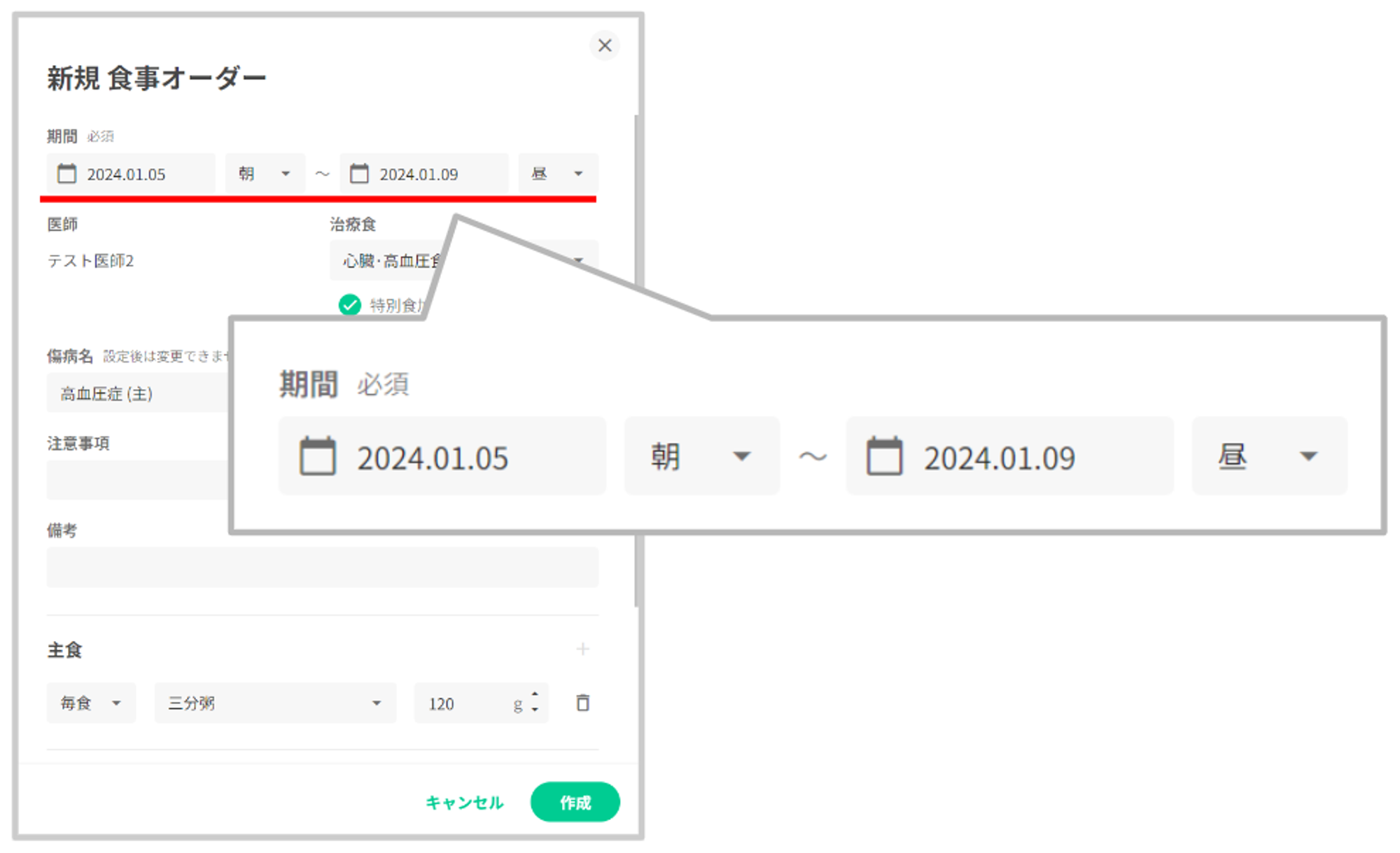 単日オーダーであり夕食のみのオーダーの場合、「開始日=終了日」となるため開始日のみ表示いたします。