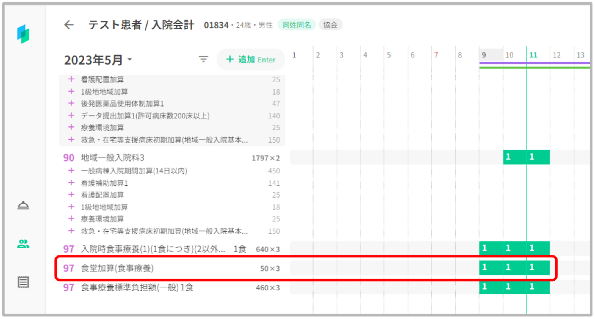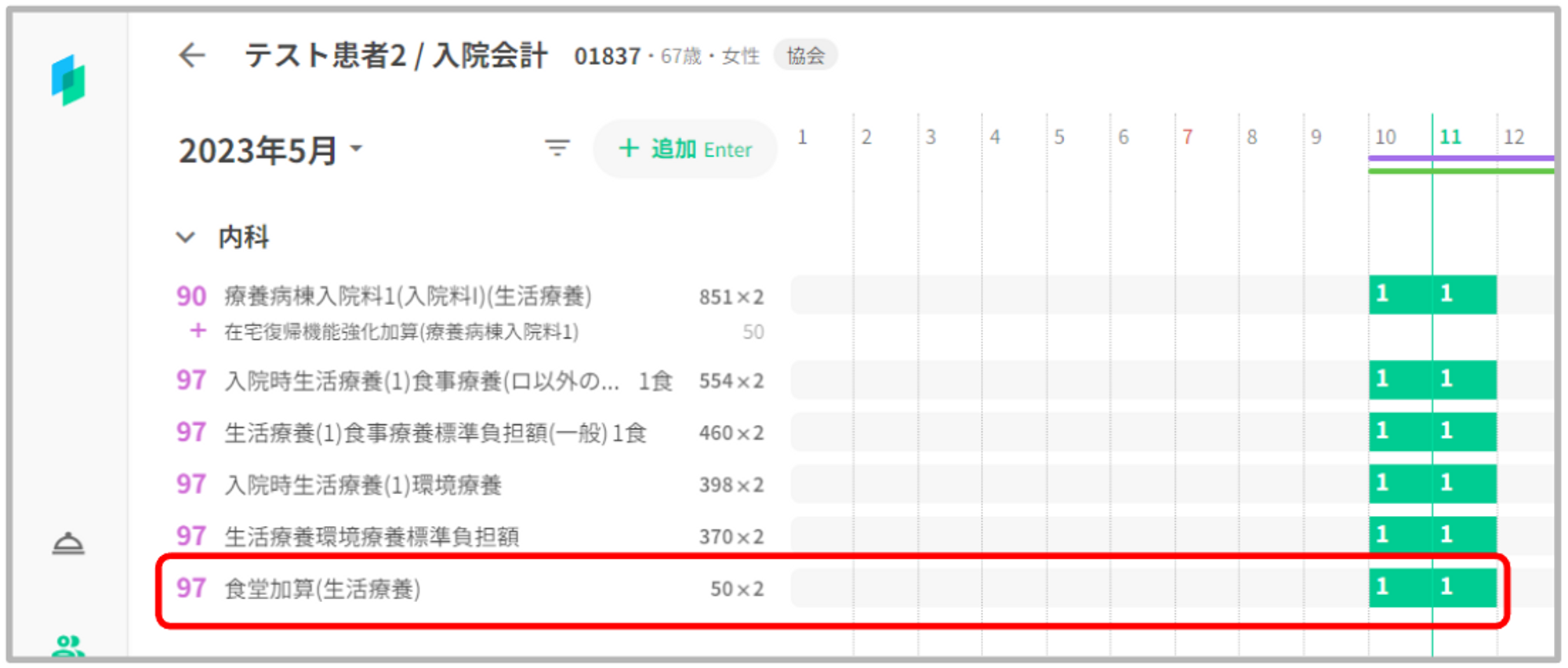 入院時食事療養費を算定している患者様は「食堂加算(食事療養)」が、入院時生活療養費を算定している患者様は「食堂加算(生活療養)」が自動で入力されます。