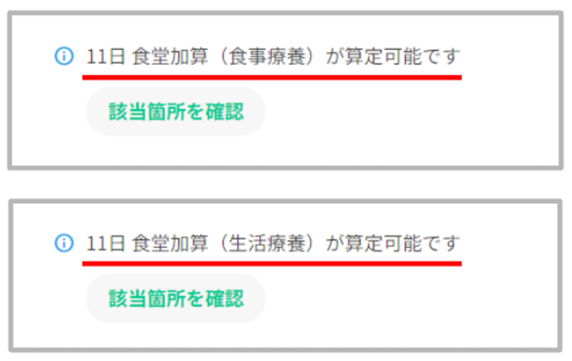 食堂加算の算定条件を満たしており、該当日に食堂加算が入力されていない場合は確認メッセージが表示されます。