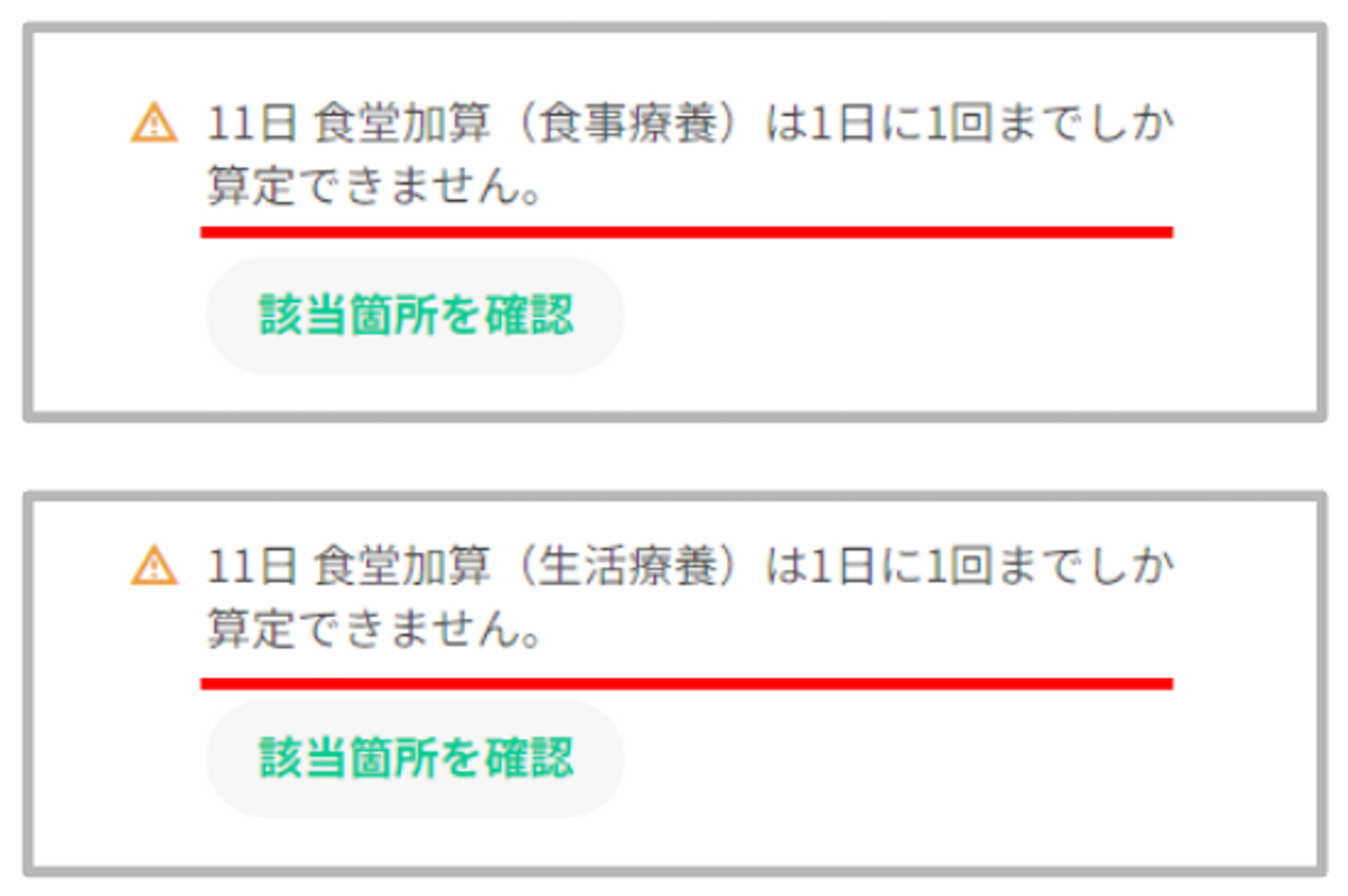 また、同日に2回以上の食堂加算が算定されている場合はエラーメッセージが表示されます。