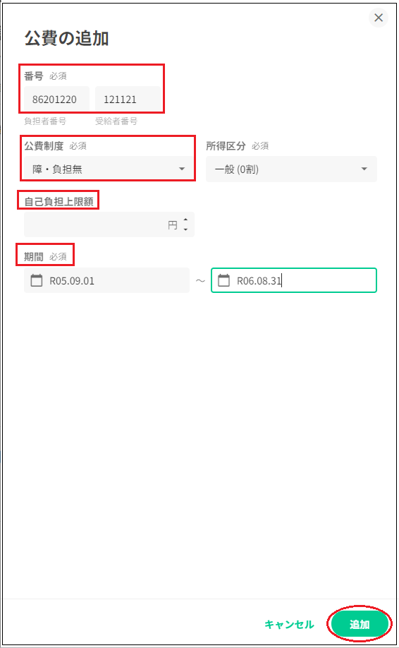 1.重度心身障害者等医療費制度の受給者証の公費番号を登録します 2.「公費制度」欄に、「障・負担無」が表示されていることを確認します 3.「自己負担上限額」欄には金額の登録は不要です 4.「期間」を登録します 5.受給者証の登録が終了したら、右下の追加をクリックし終了です