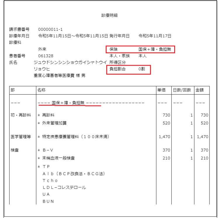 ・明細書上で、登録した保険の種類と受給者証が反映されていることが確認できます
