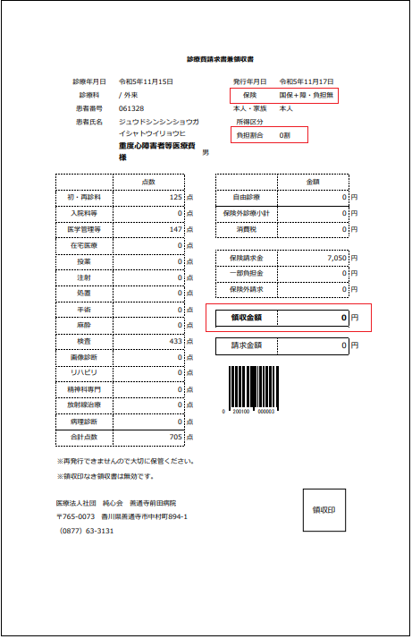 ・領収額は0円のため患者様にお渡しすることはないかもしれませんが、領収書上でも登録した保険の種類と受給者証が反映されていることが確認できます