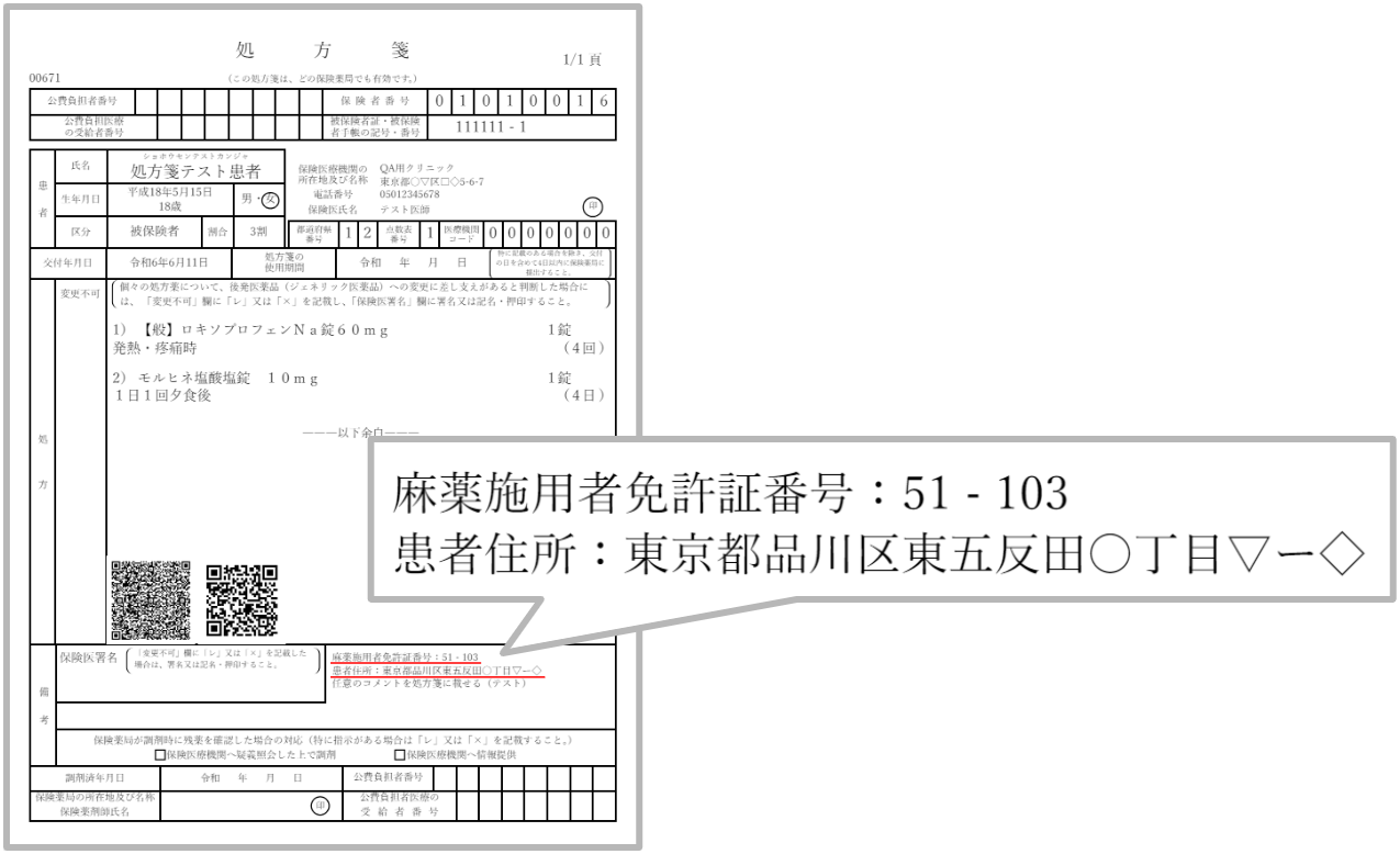 院外処方に麻薬が含まれている場合、処方箋に麻薬施用者免許番号や患者住所が自動で印字されます