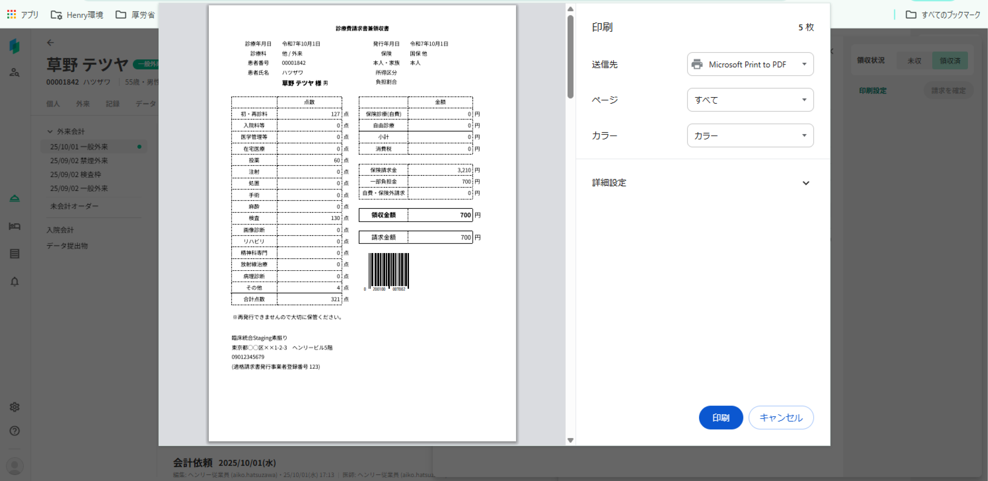 請求確定と同時に全額の領収を記録し、ブラウザの印刷プレビュー開きます